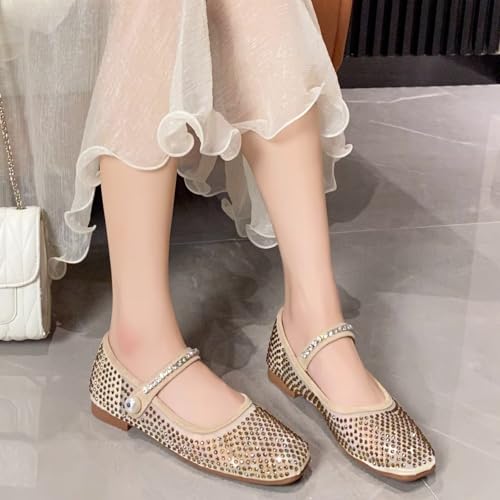 WENJIAZHIZHI Women's Pearl Mary Jane Flats Crystal Square Toe Ankle Buckle Dressy Ballets Flat Shoes Mesh Dress Ballerian Flats 5