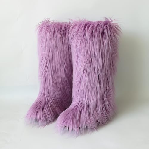 QMFUR Women's Furry Knee High Snow Boots Faux Fur Mid-Calf Boot Fluffy Flat boot Winter Warm Fashion Boots 4