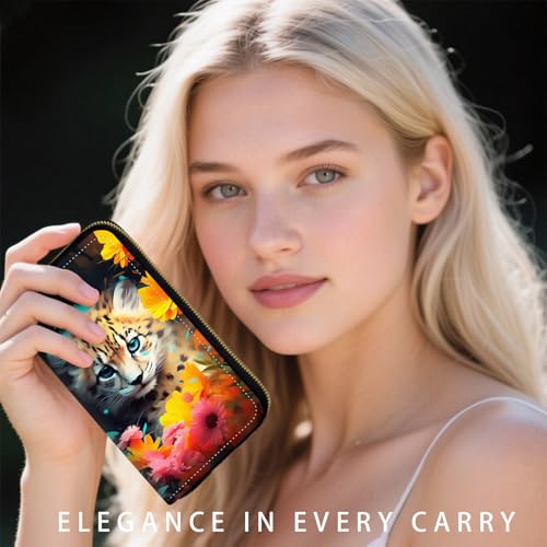 RFID Blocking Women's Wristlet Purse - Detachable Wrist Strap, Compact Foldable Design with 12 Card Slots & Zip Pocket Wallet for Travel,Gym,Everyday Security,Cute Baby Leopard Flower 1