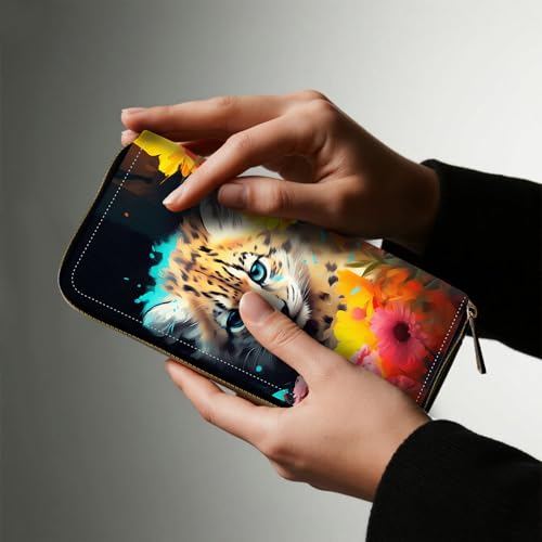 HOT ! RFID Blocking Women's Wristlet Purse - Detachable Wrist Strap, Compact Foldable Design with 12 Card Slots & Zip Pocket Wallet for Travel,Gym,Everyday Security,Cute Baby Leopard Flower