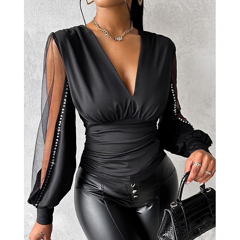 Highlights [Fabric] Crafted from high-quality polyester, this black blouse offers a micro-elastic finish for a comfortable and flattering fit. The soft and stretchy material ensures ease of movement, making it ideal for both daily and work wear during the fall and winter seasons. [Fit] Designed with a form-fitting silhouette, this blouse accentuates the body's natural curves, providing a sleek and stylish look. The regular top length is perfect for pairing with your favorite trousers or skirts. [Design Highlights] Featuring a sophisticated V-neckline, this blouse includes modern mesh and patchwork elements that enhance its contemporary charm. The long, sheer sleeves are not only adorned with delicate rhinestone embellishments but also have trendy cut-out details for an added touch of glamour. [Occasions] Suitable for a variety of occasions, whether it's a day at the office or a stylish casual outing. This blouse seamlessly transitions from professional settings to relaxed social gatherings, ensuring you look elegant and fashionable. [Size Range] Available in a comprehensive size range from S to 2XL, catering to diverse body types and ensuring a perfect fit for every wearer. Choose from an array of colors including Purple, Brown, Black, and Red to suit your personal style.