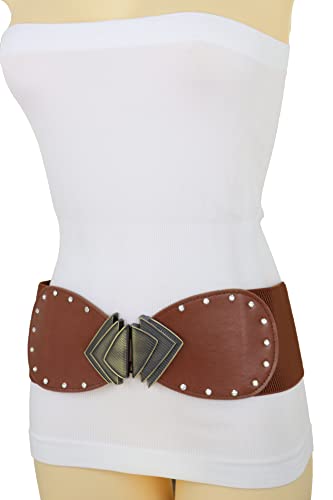 Women Fashion Wide Elastic Brown Belt Hip High Waist Gold Metal Fans Buckle Size S M 5
