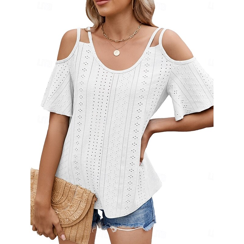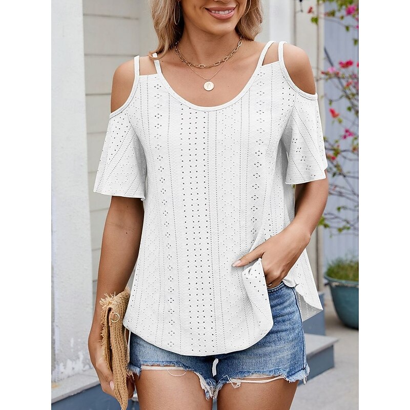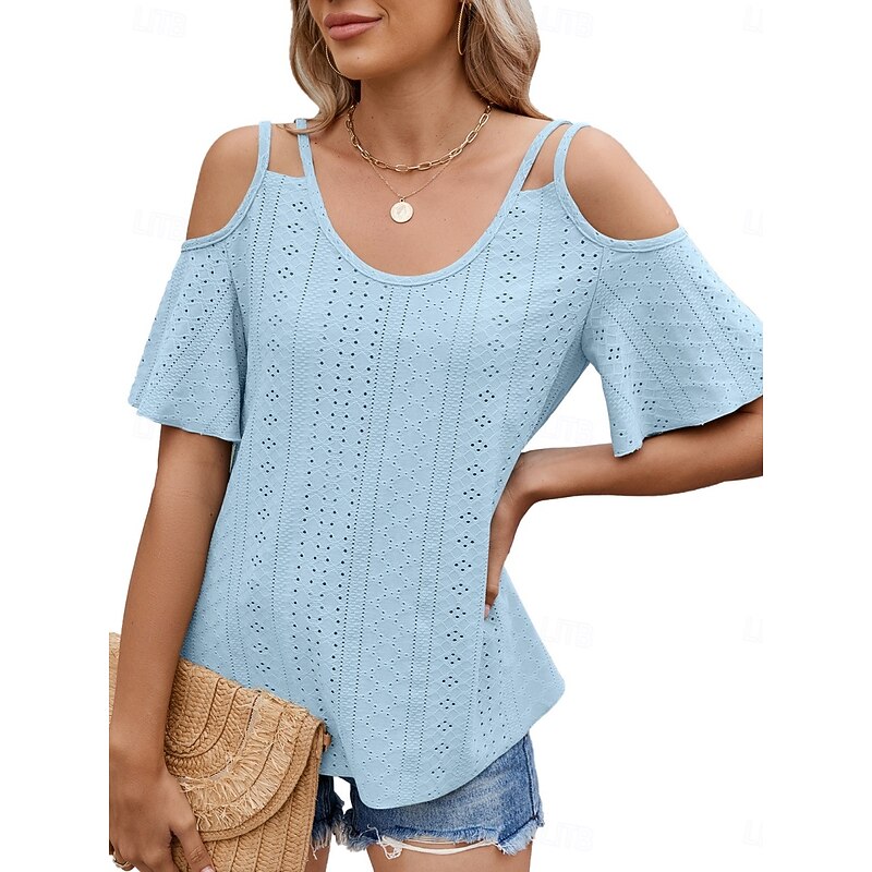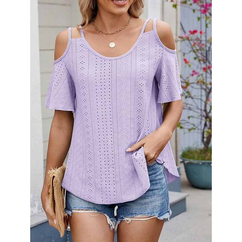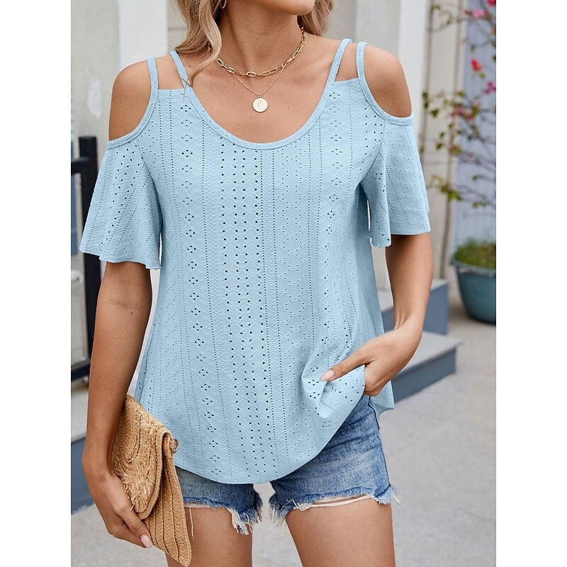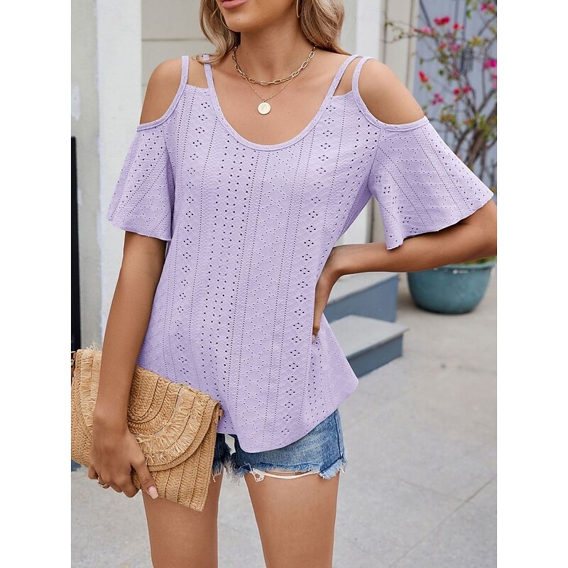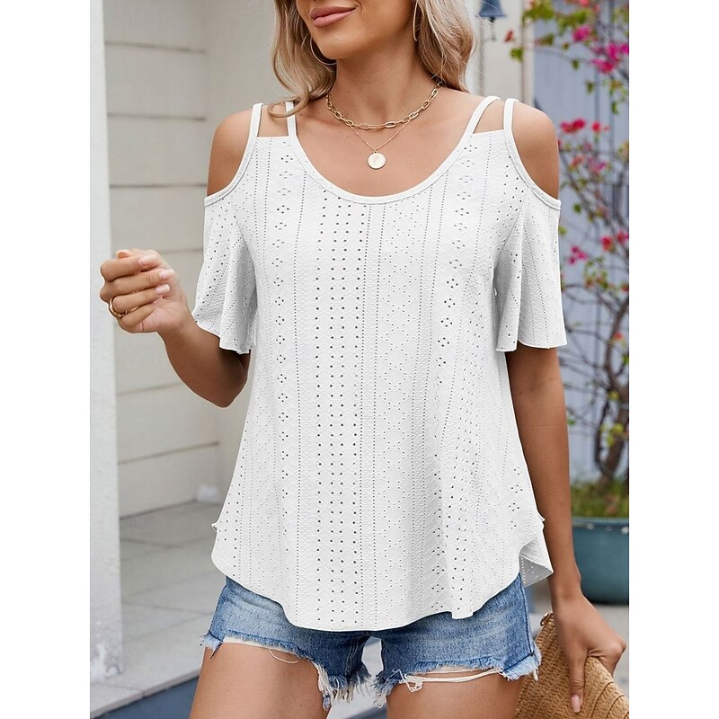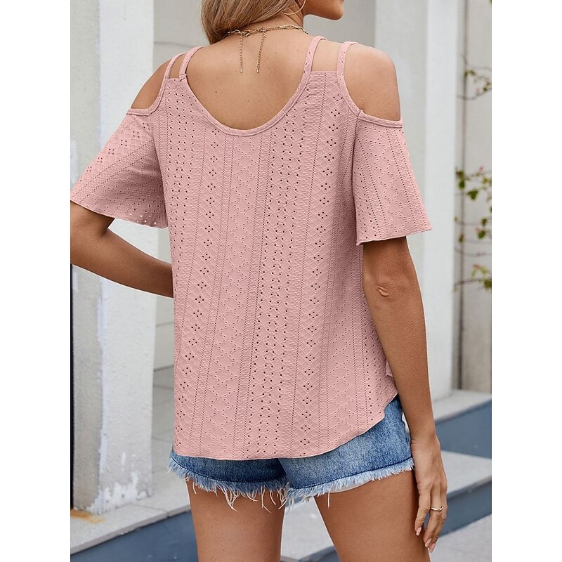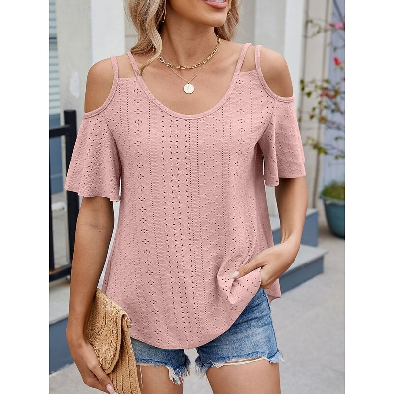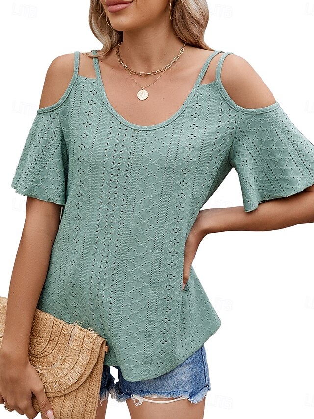 Women's Shirt Blouse Solid Color Stylish Casual Short Sleeve Strap Regular Tops Daily Eyelet Sage Green Black White Pink Sky Blue Summer 25