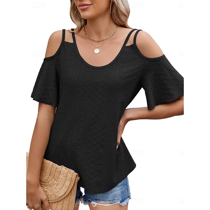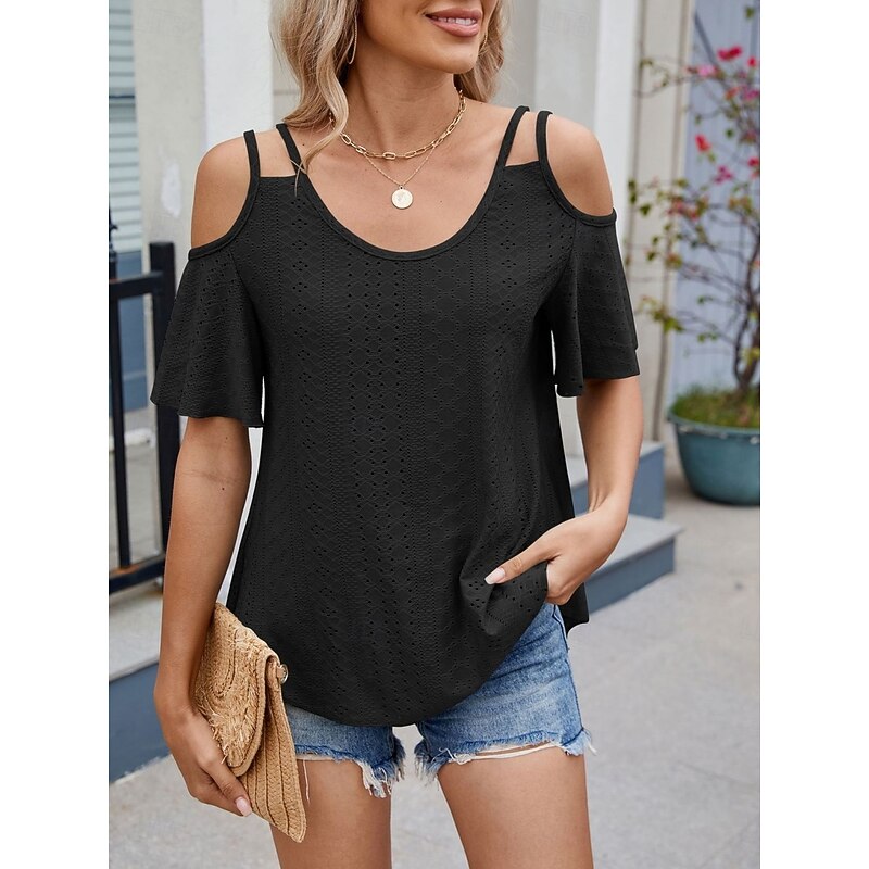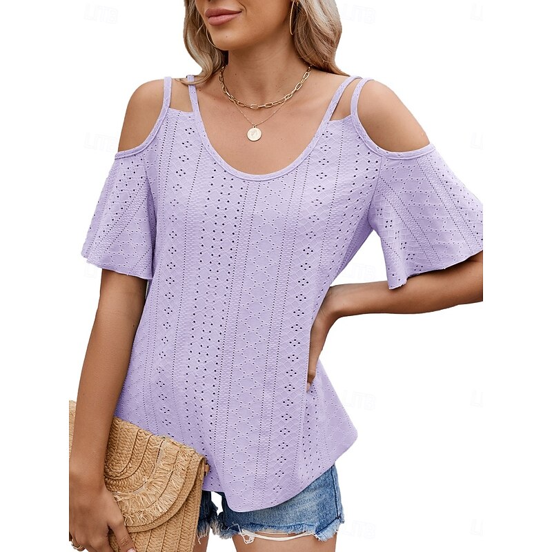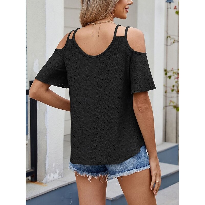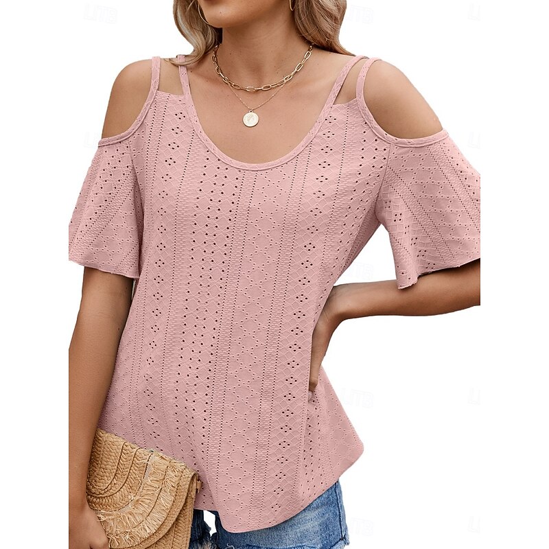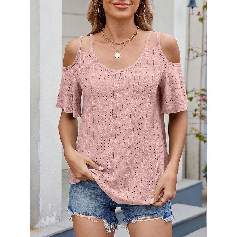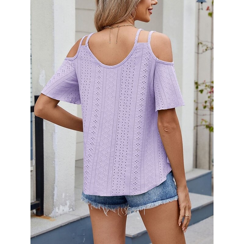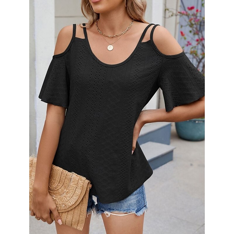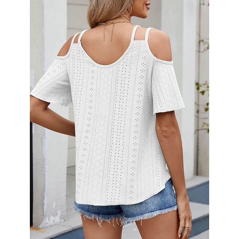 Women's Shirt Blouse Solid Color Stylish Casual Short Sleeve Strap Regular Tops Daily Eyelet Sage Green Black White Pink Sky Blue Summer 25