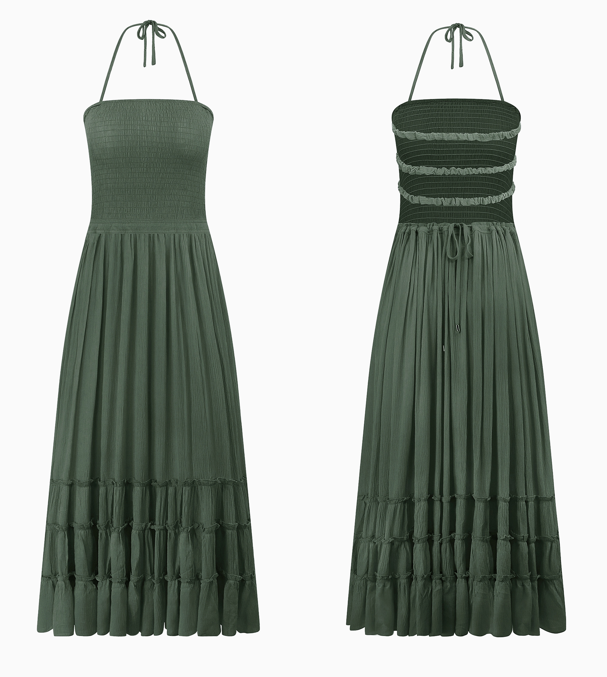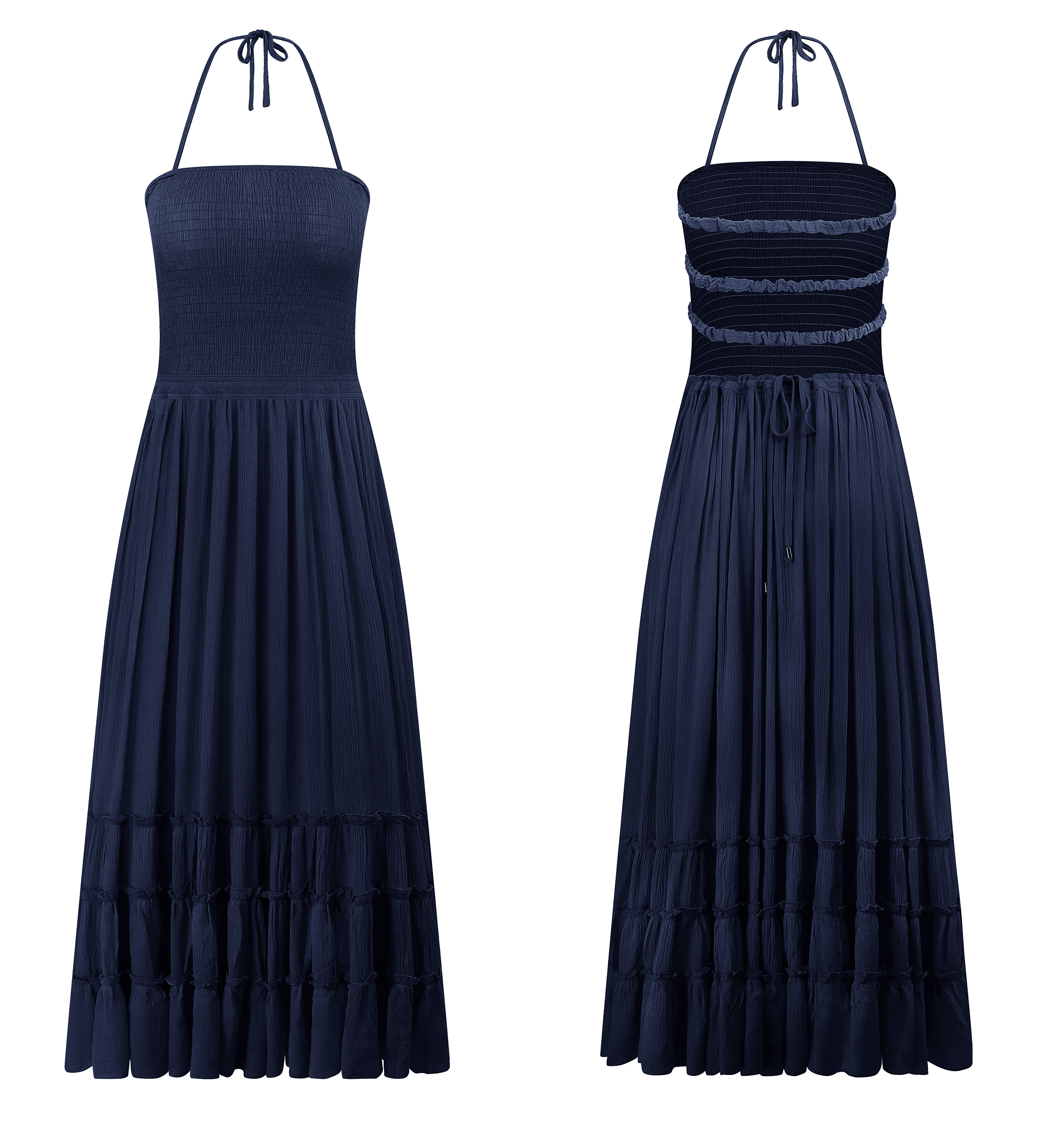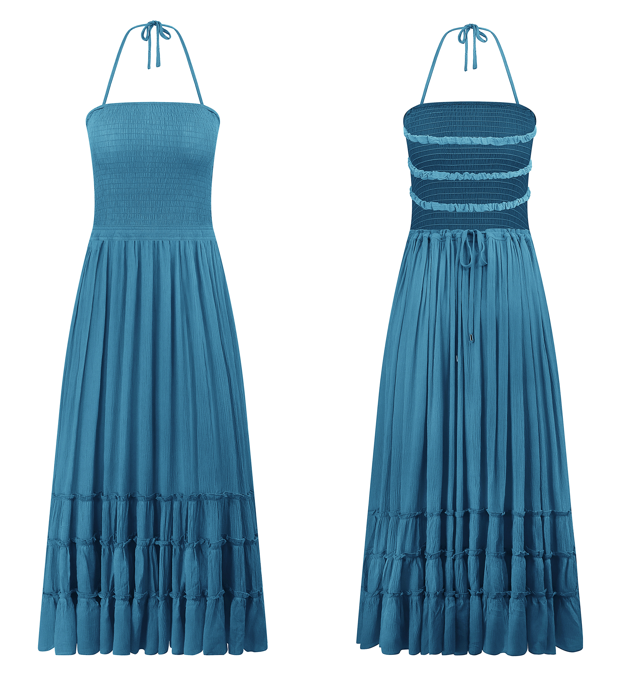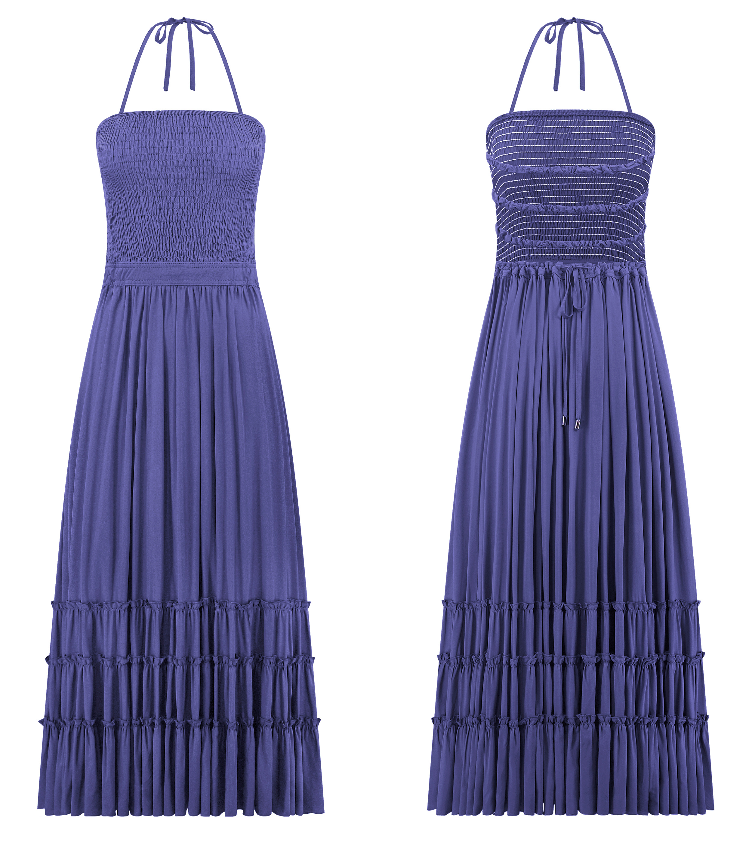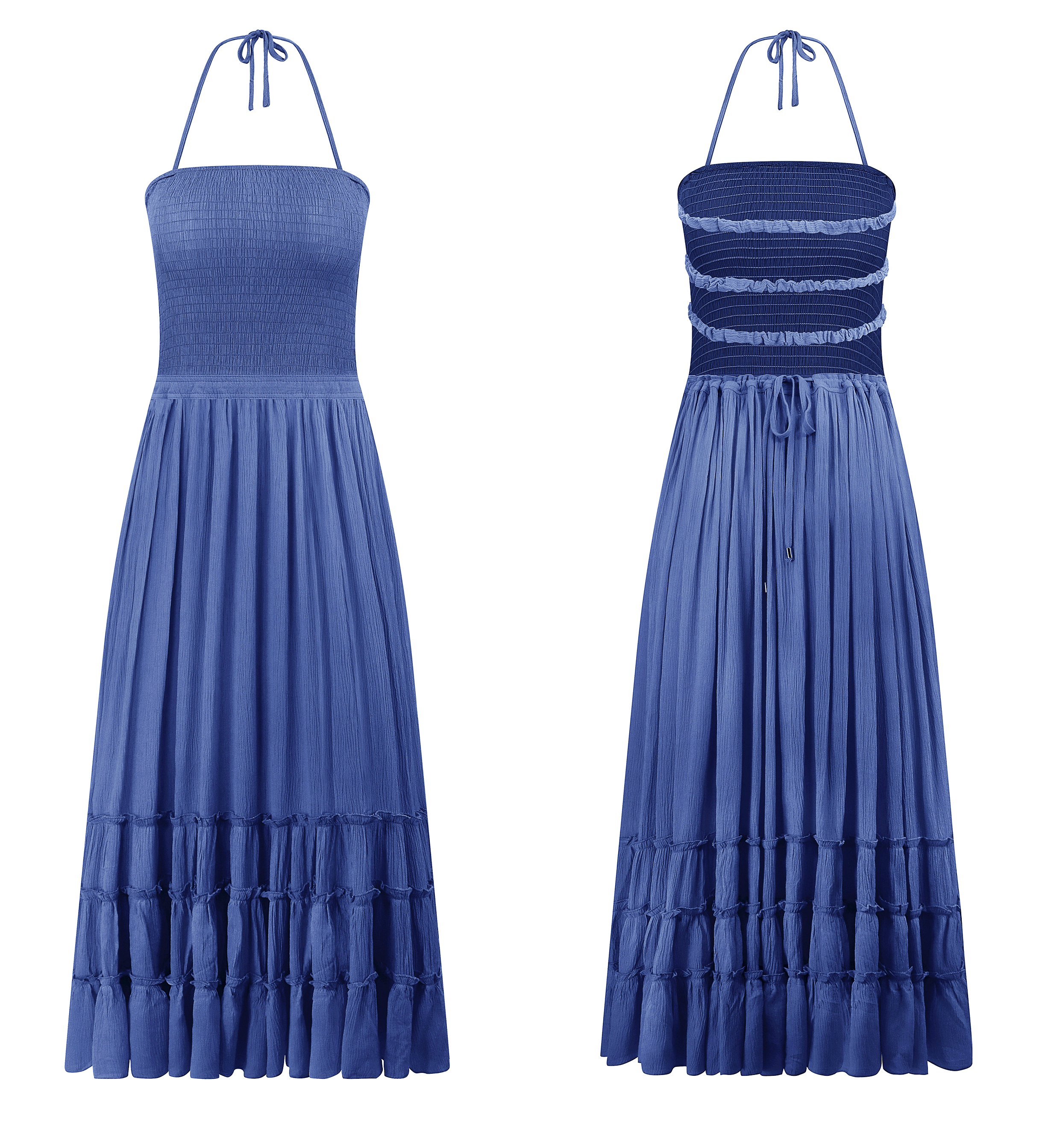 The slim fit dress blends romance and Bohemian, exuding a feminine vibe! It features a smocked bodice which flexibly fit different bust sizes while keep snug at the chest area. In additions, adjustable tie at the halter and back waist make this dress easy fit and easy to throw on!