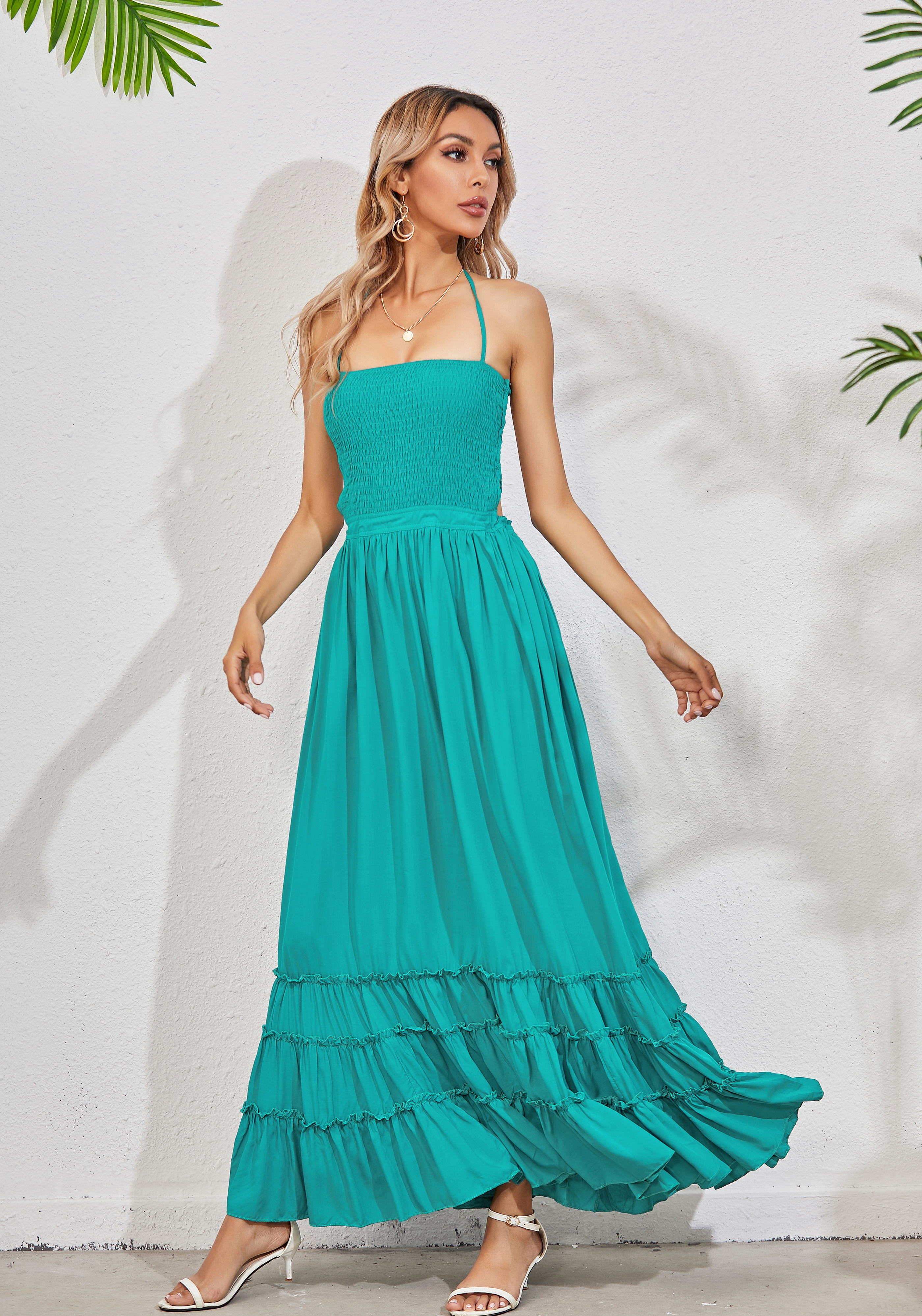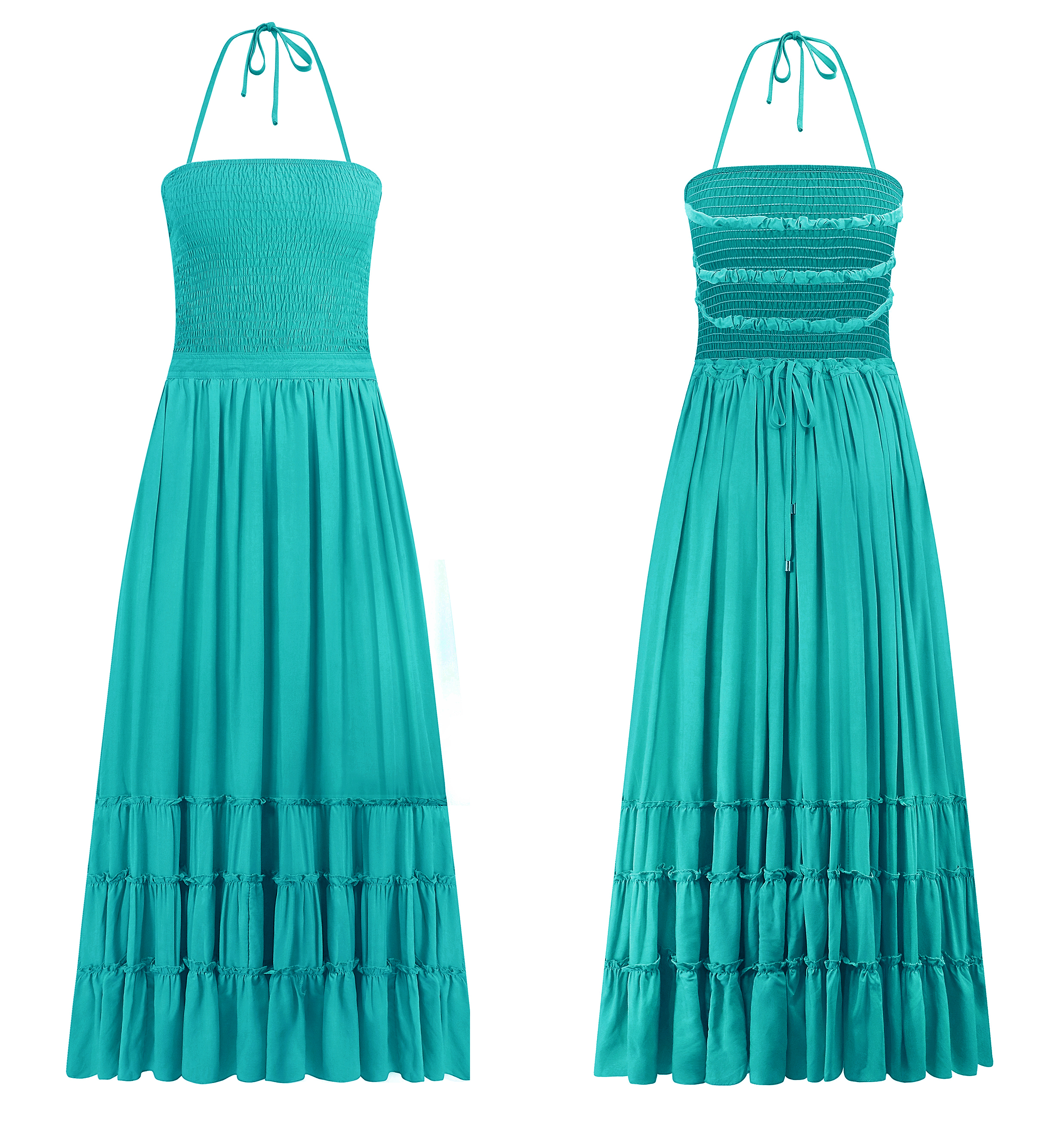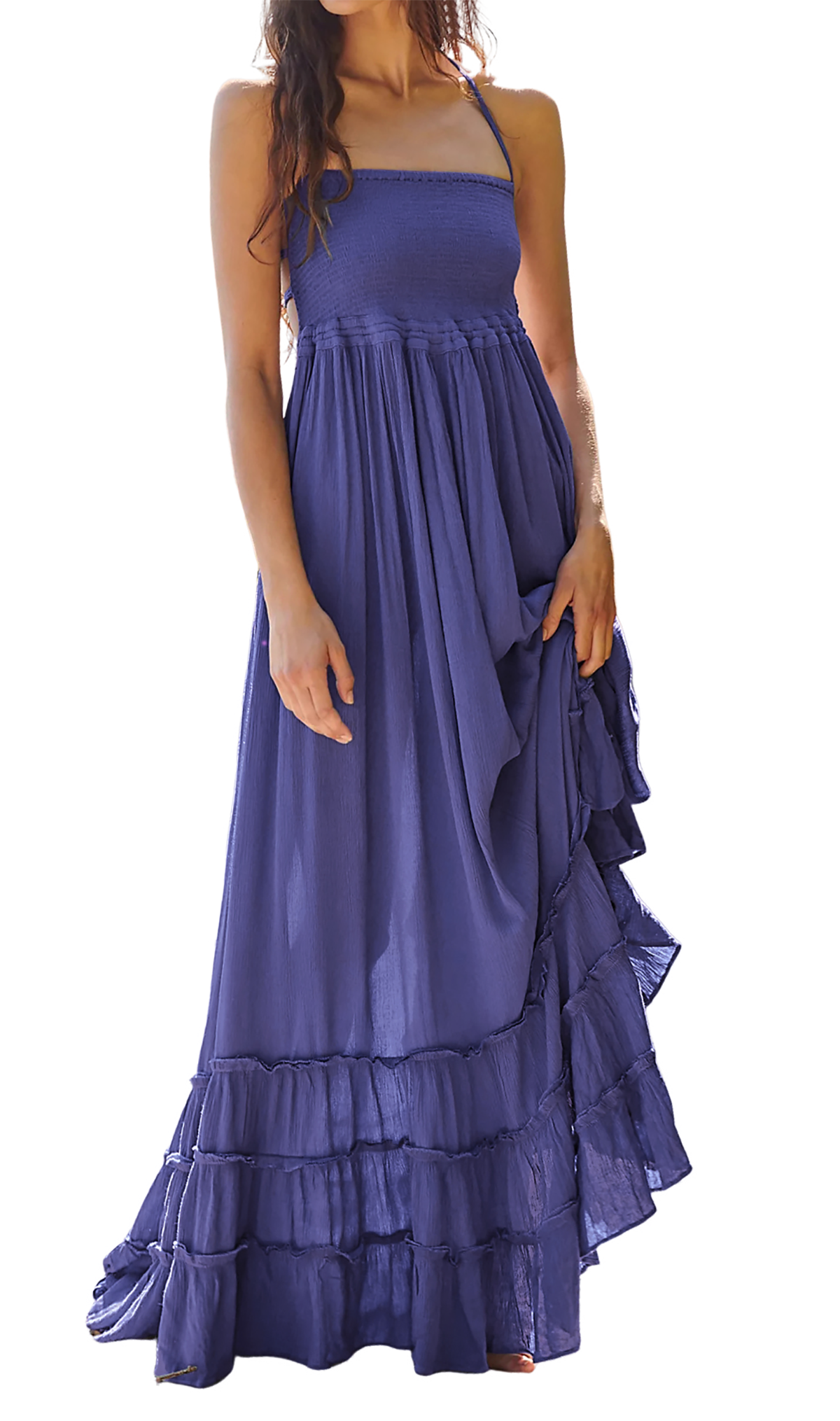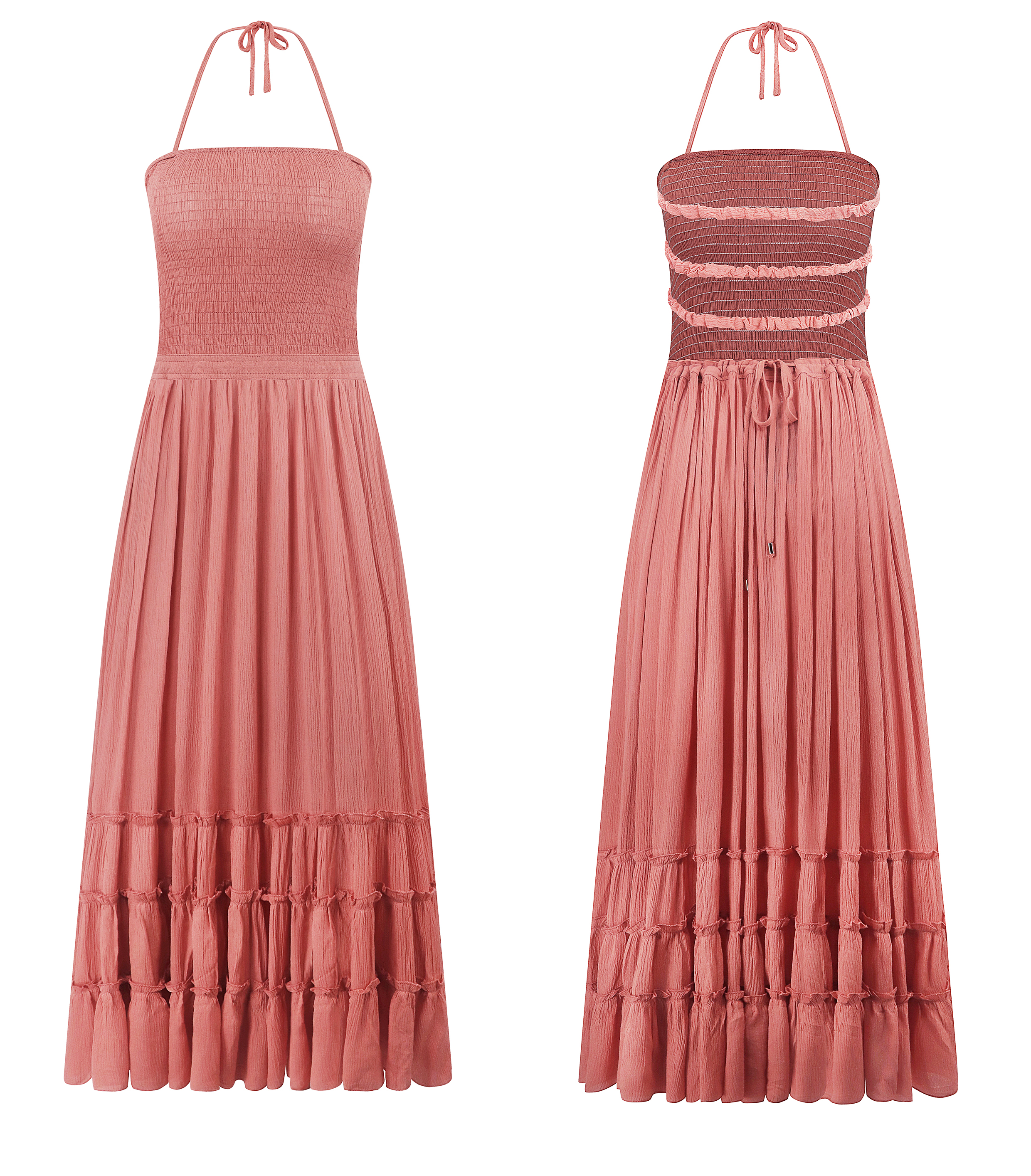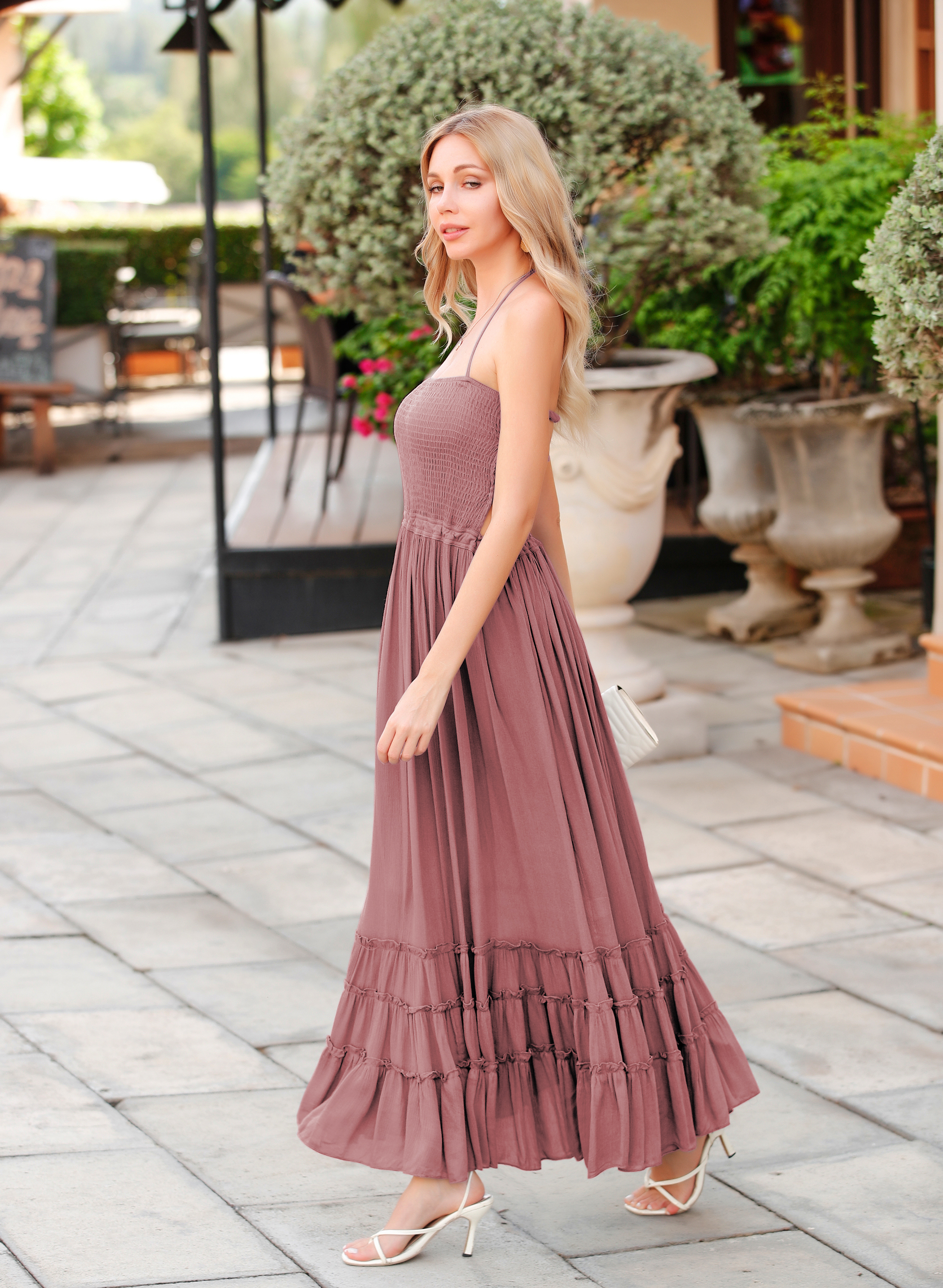 The slim fit dress blends romance and Bohemian, exuding a feminine vibe! It features a smocked bodice which flexibly fit different bust sizes while keep snug at the chest area. In additions, adjustable tie at the halter and back waist make this dress easy fit and easy to throw on!