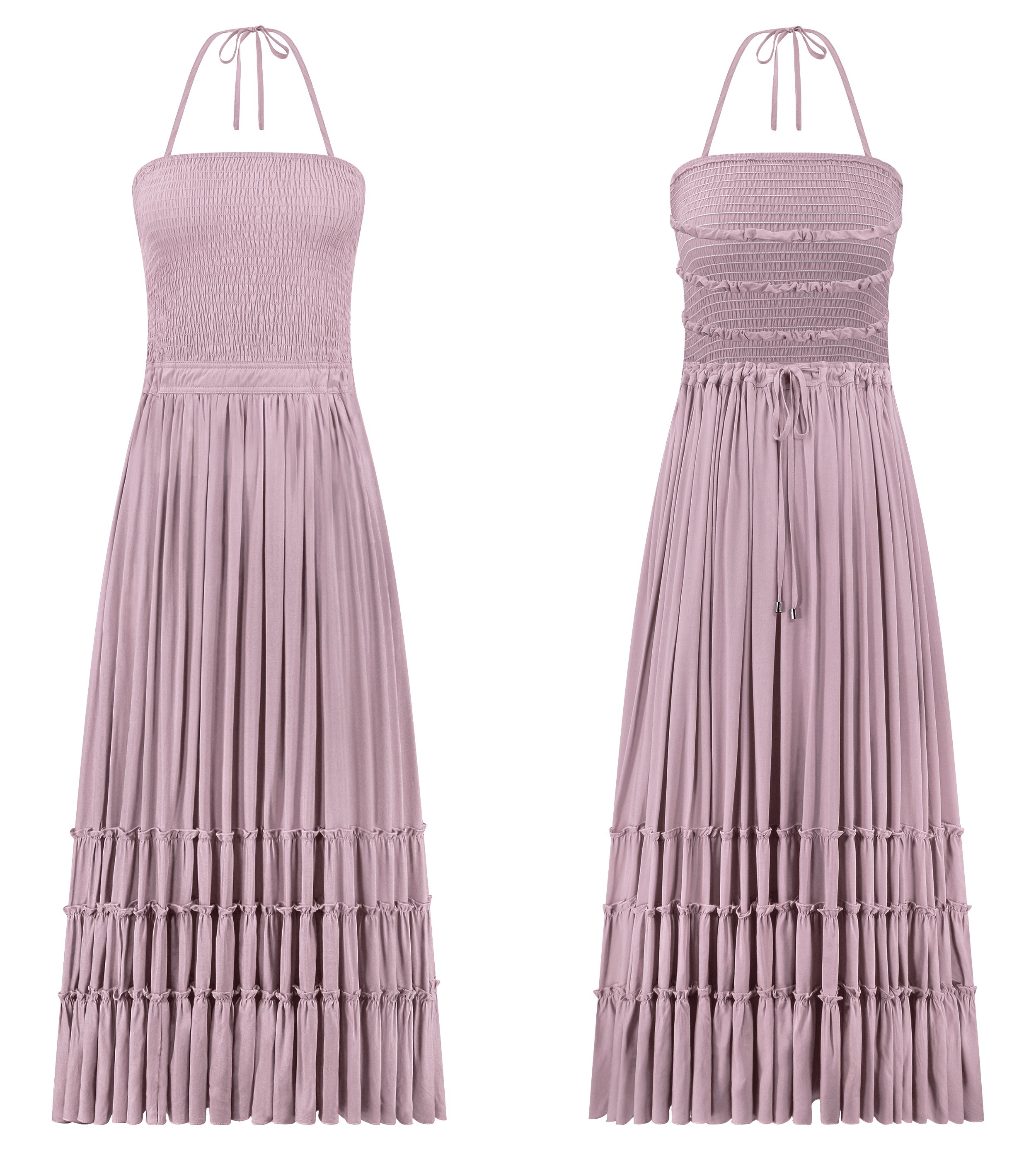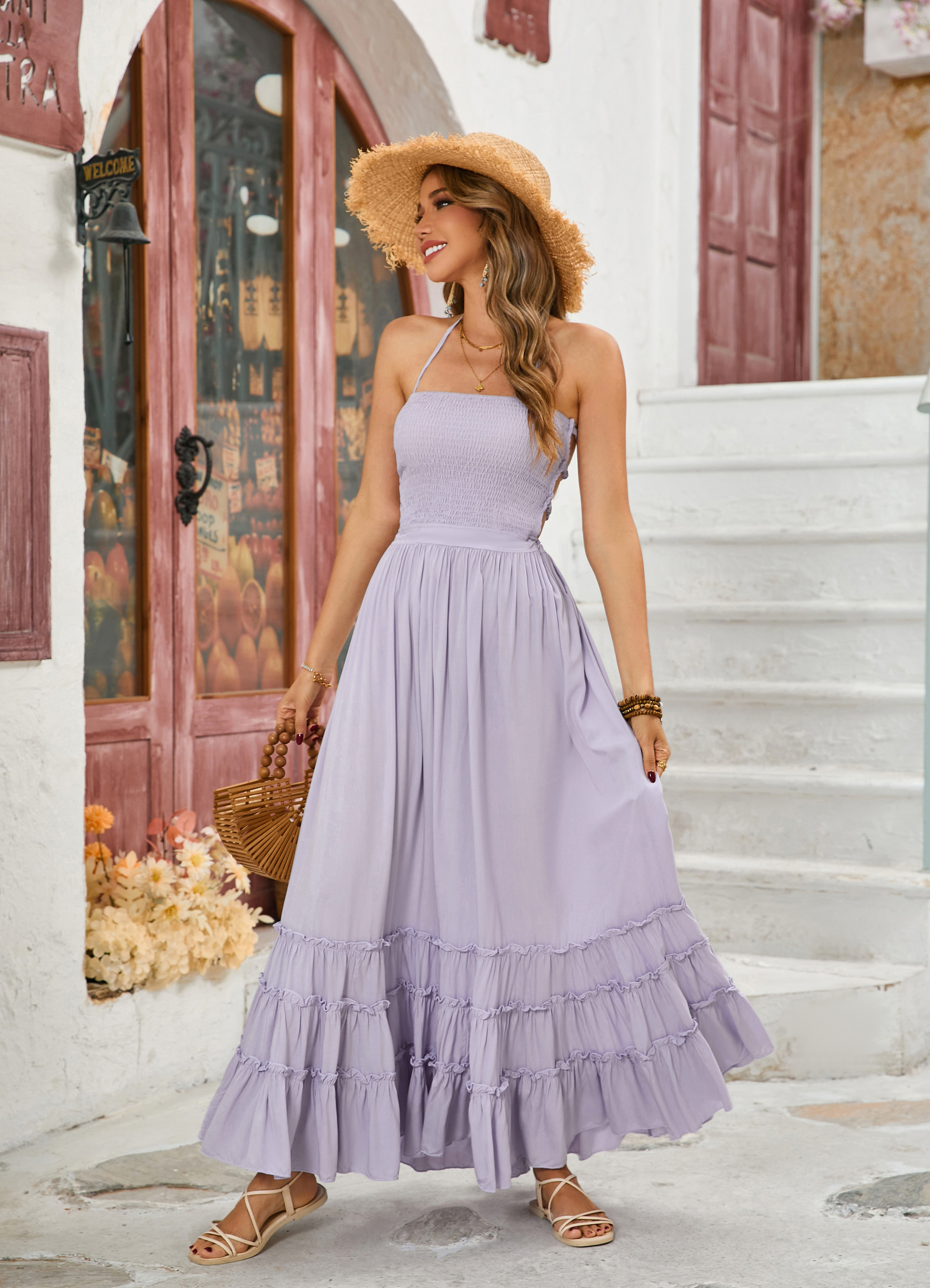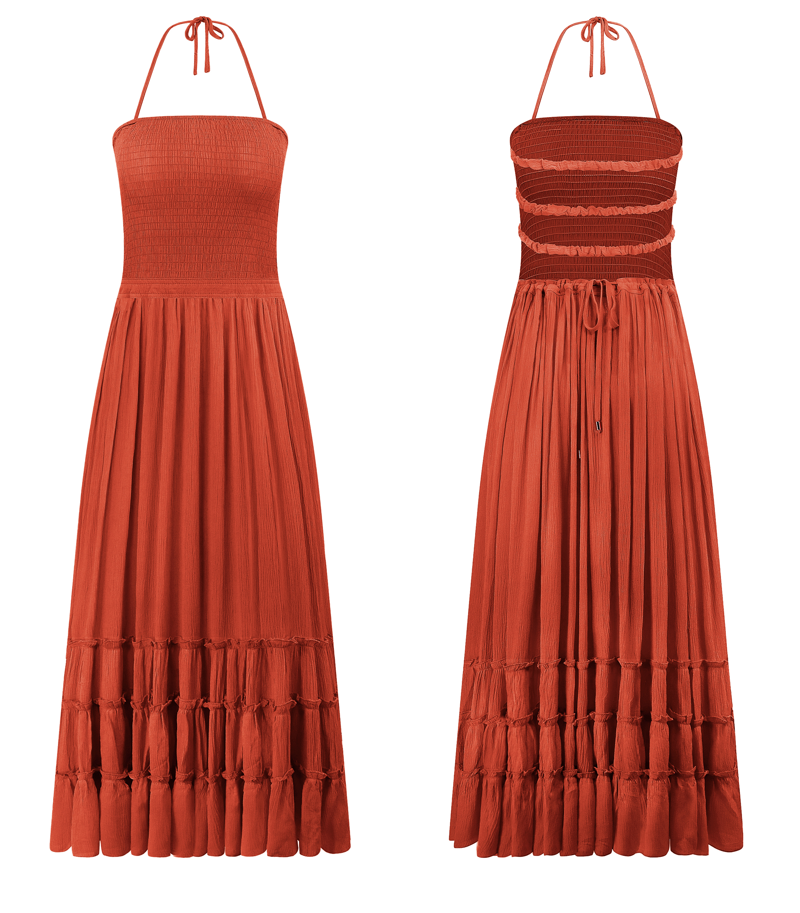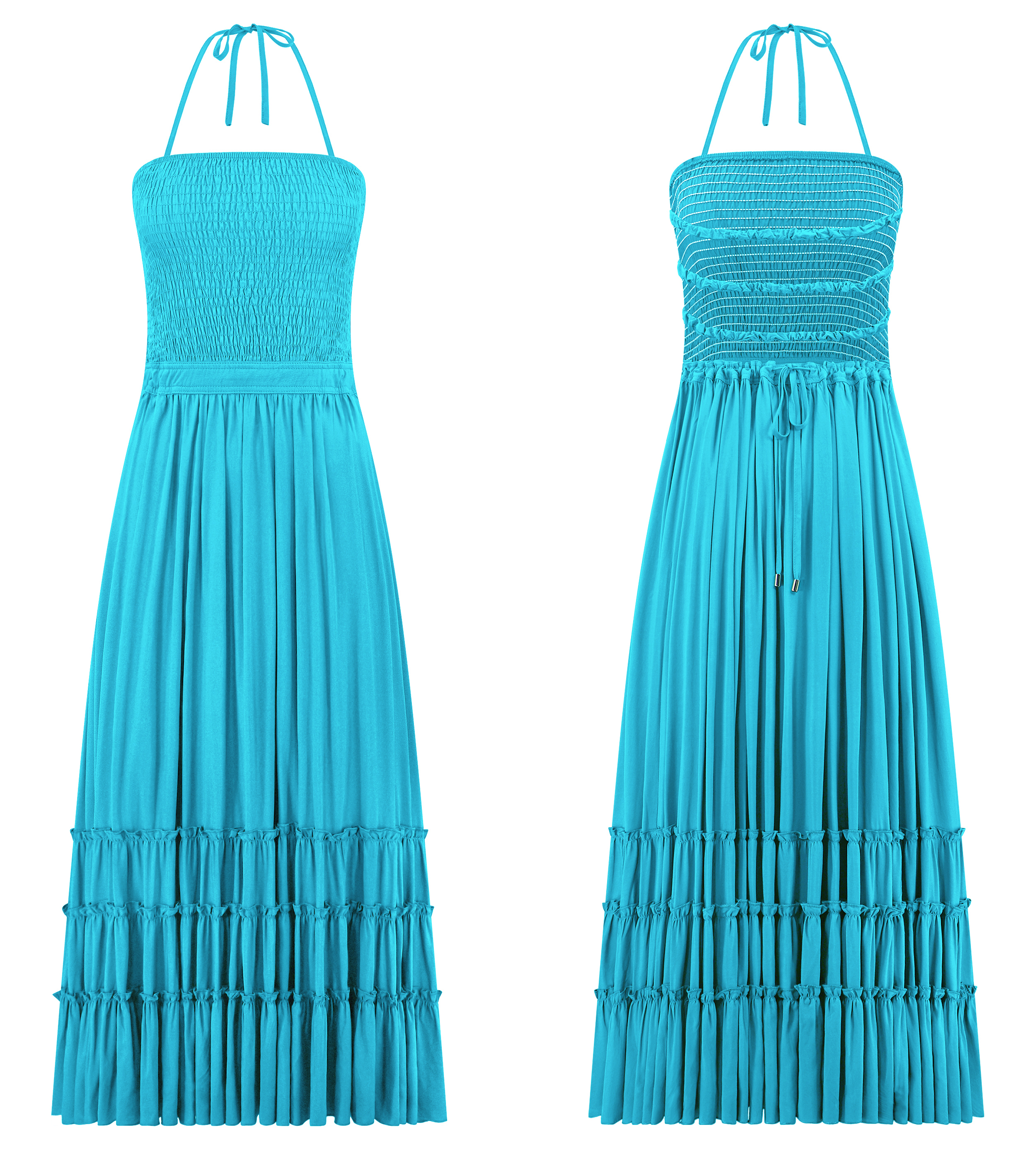 The slim fit dress blends romance and Bohemian, exuding a feminine vibe! It features a smocked bodice which flexibly fit different bust sizes while keep snug at the chest area. In additions, adjustable tie at the halter and back waist make this dress easy fit and easy to throw on!
