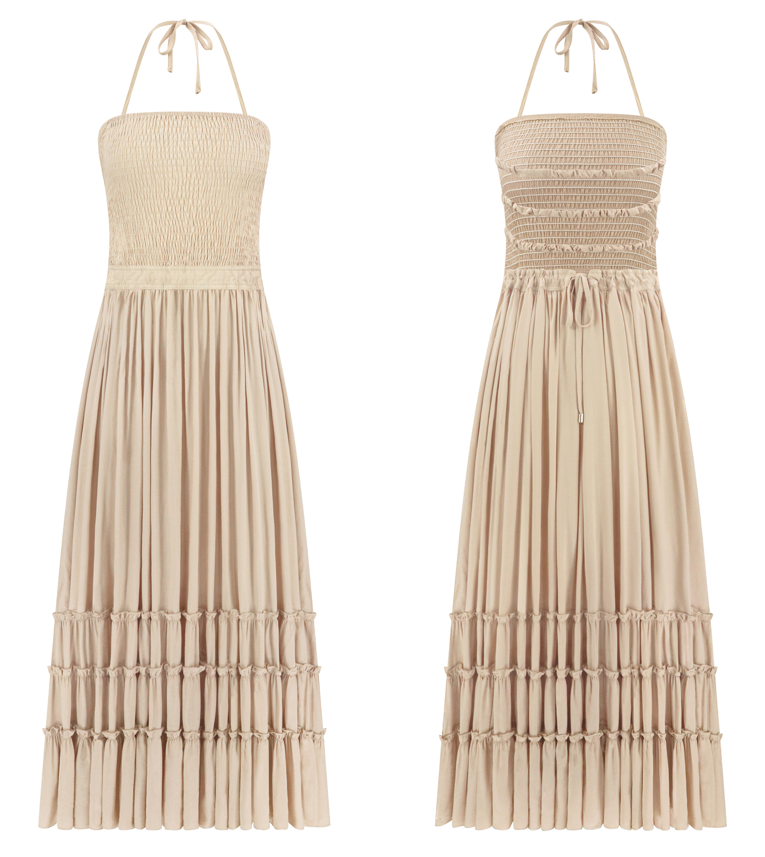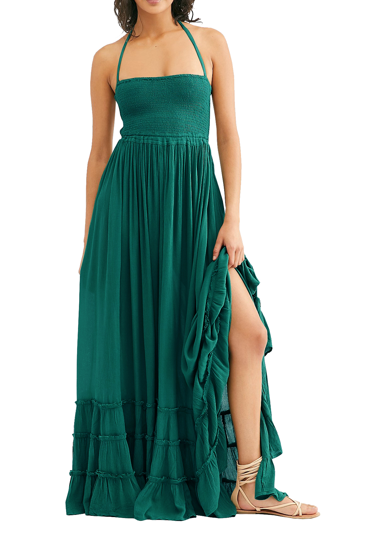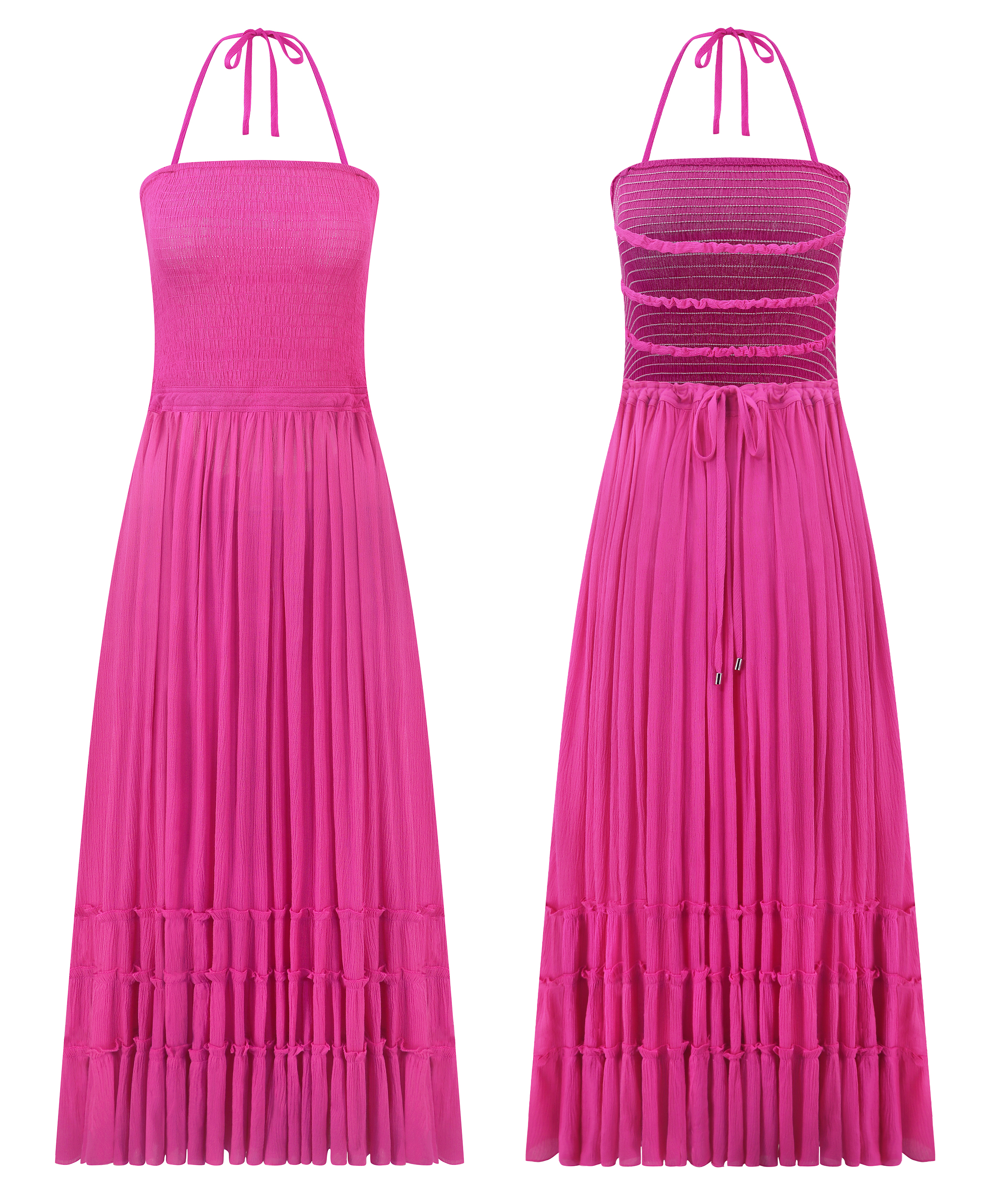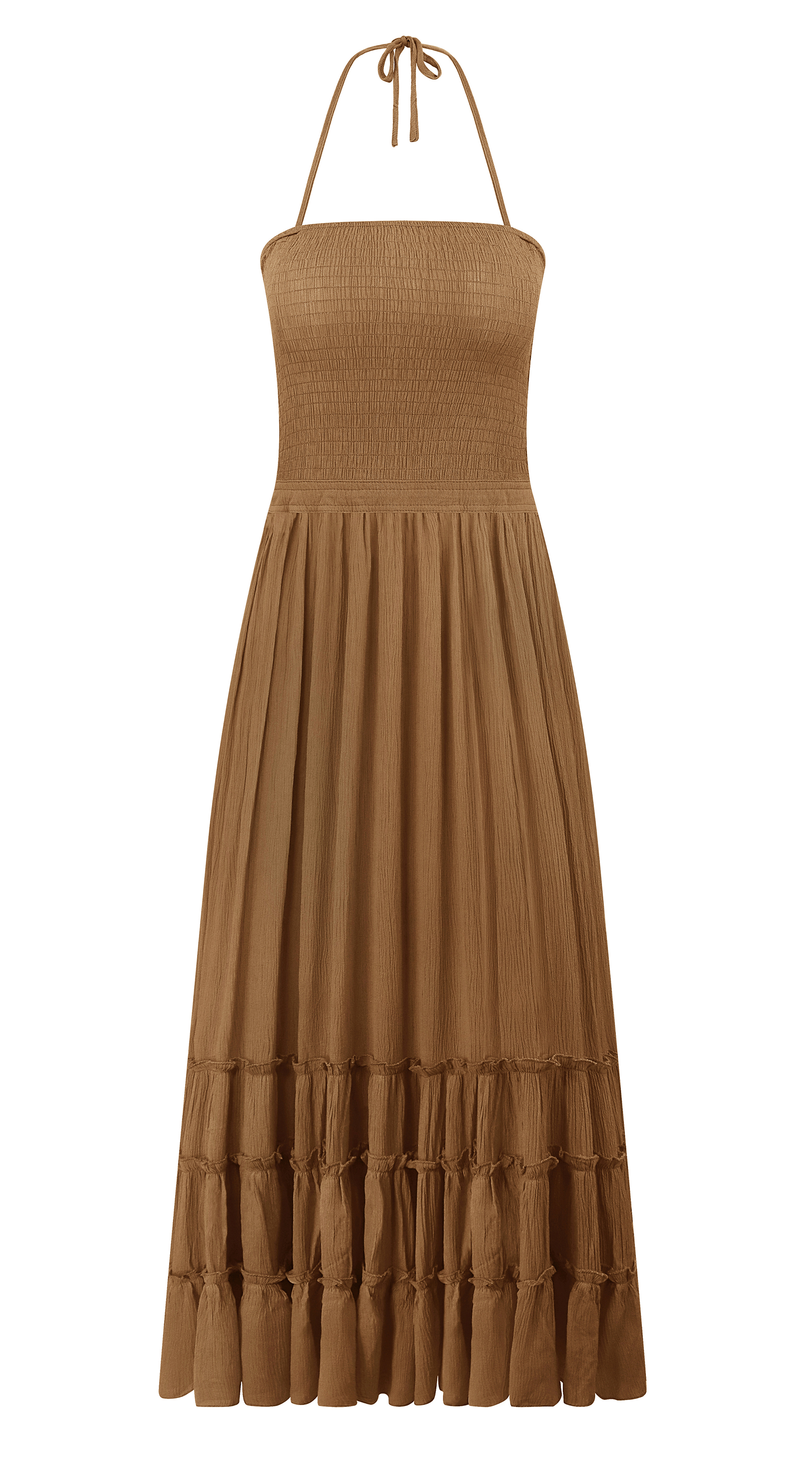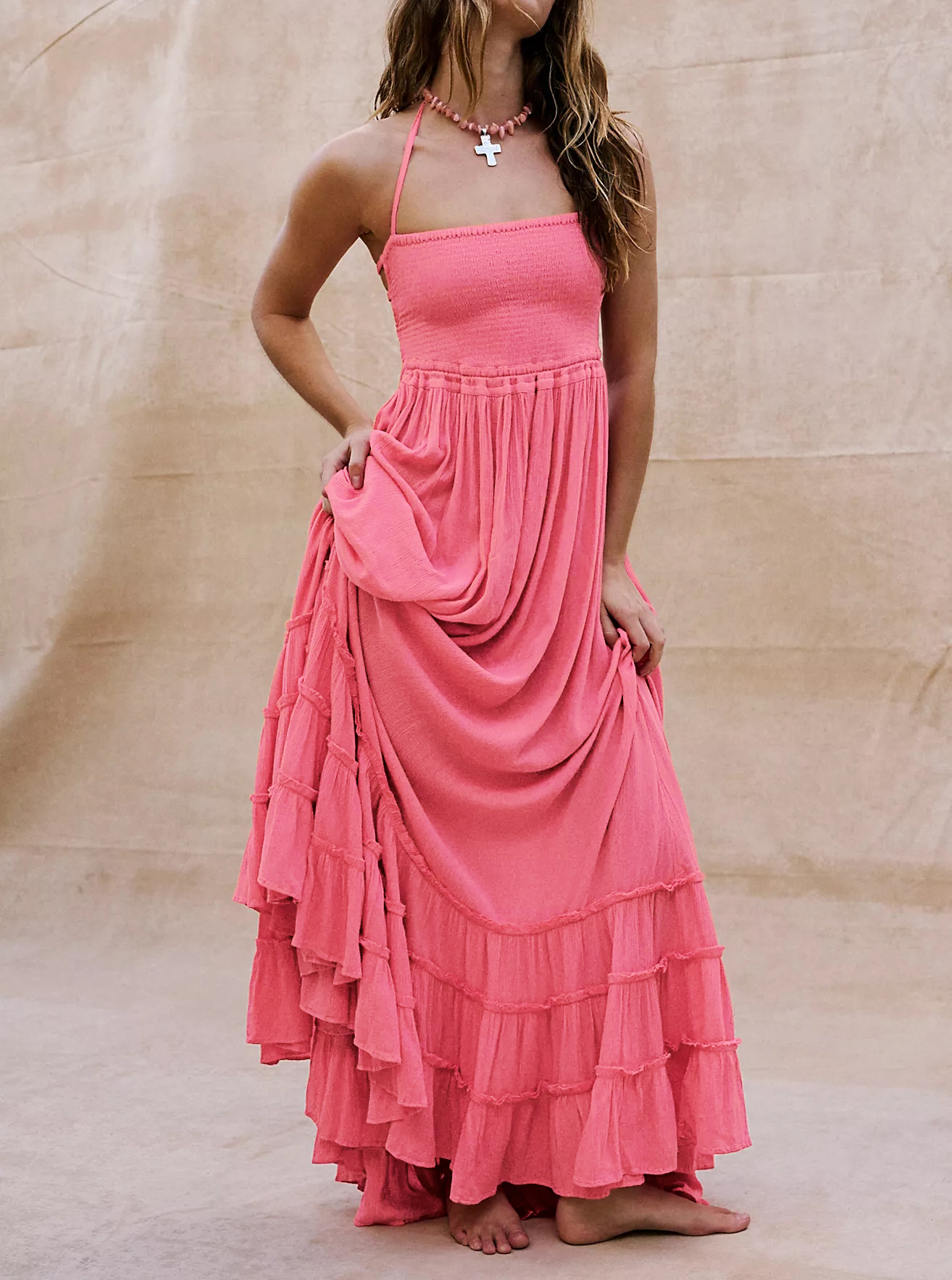The slim fit dress blends romance and Bohemian, exuding a feminine vibe! It features a smocked bodice which flexibly fit different bust sizes while keep snug at the chest area. In additions, adjustable tie at the halter and back waist make this dress easy fit and easy to throw on!