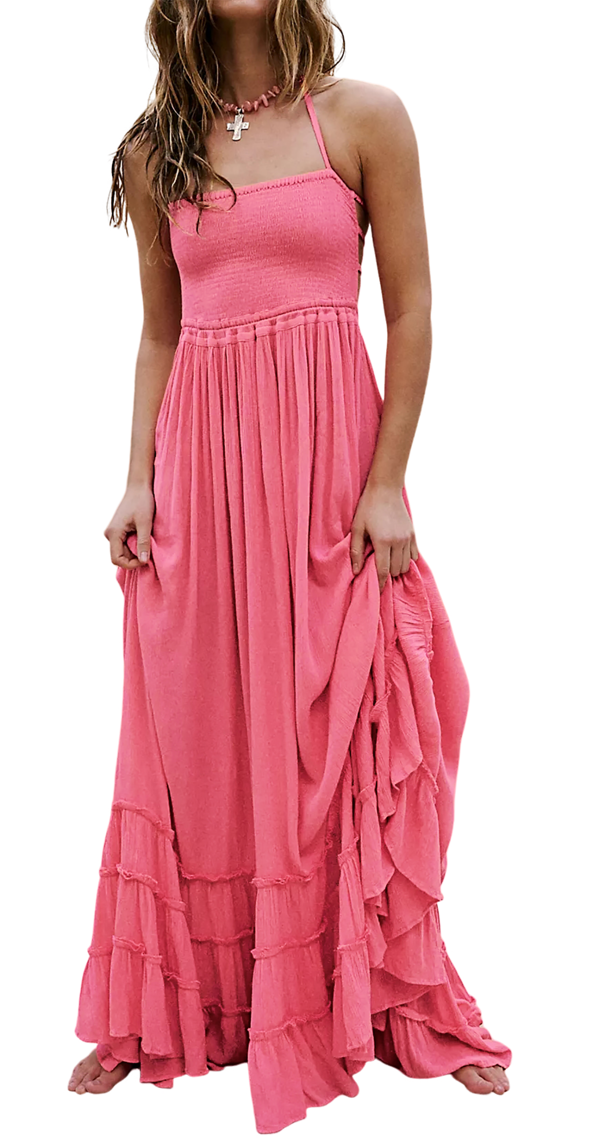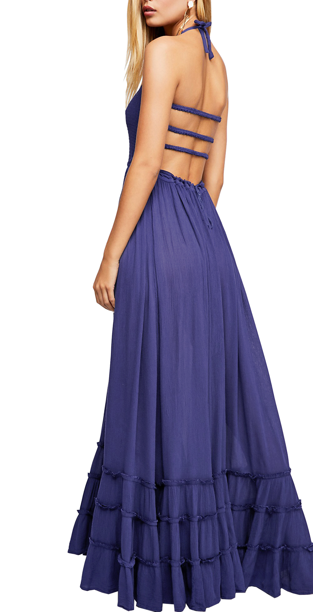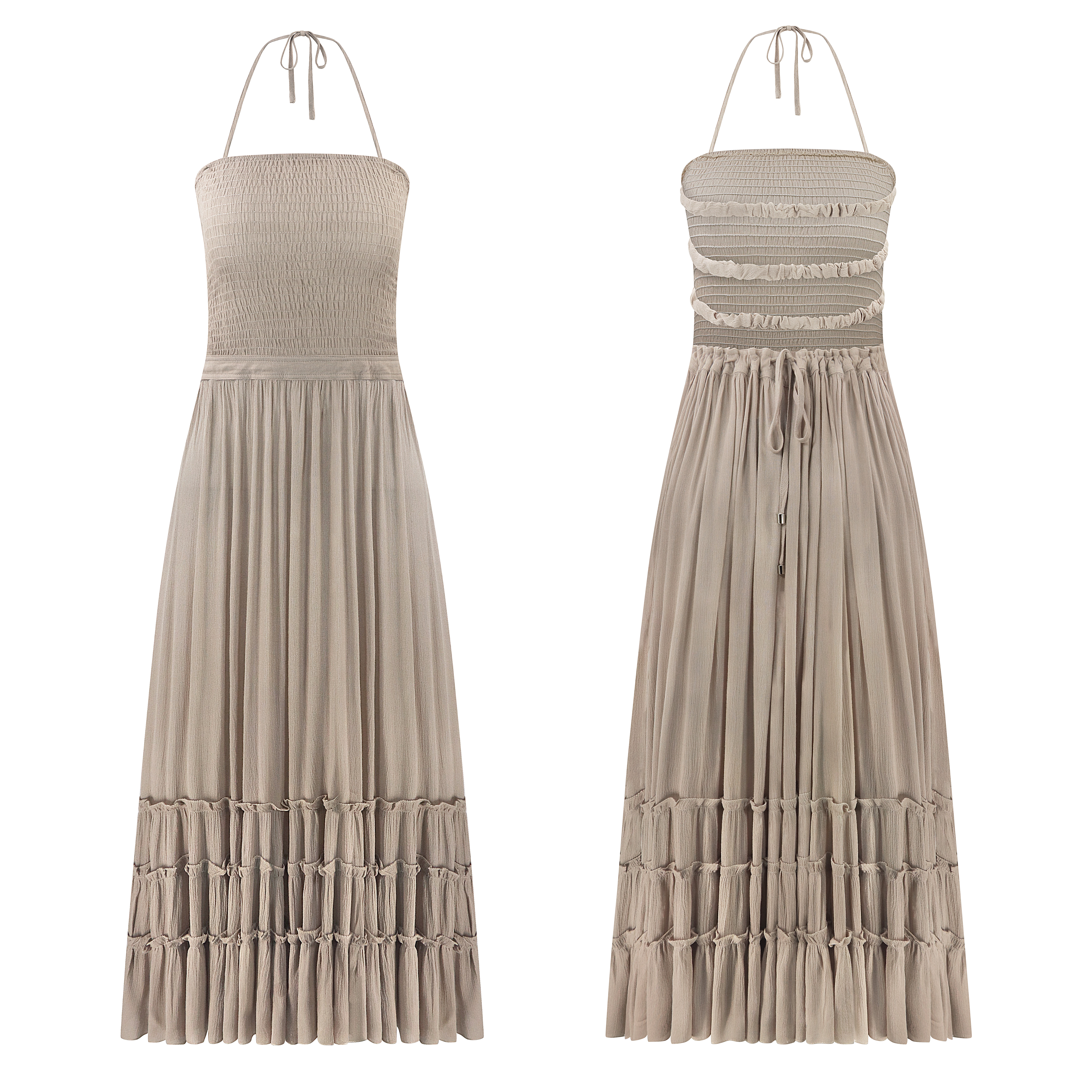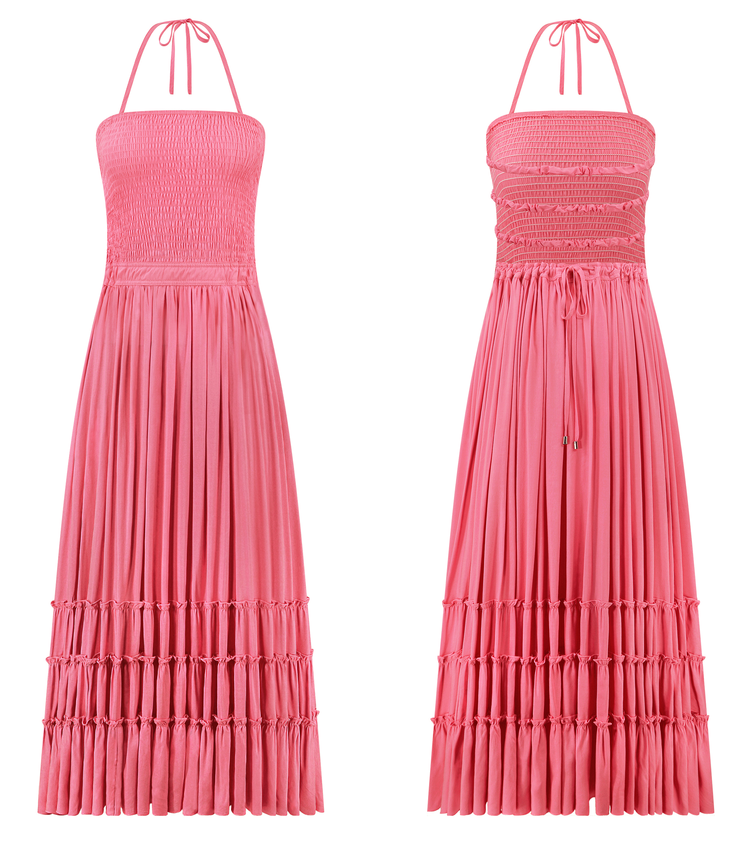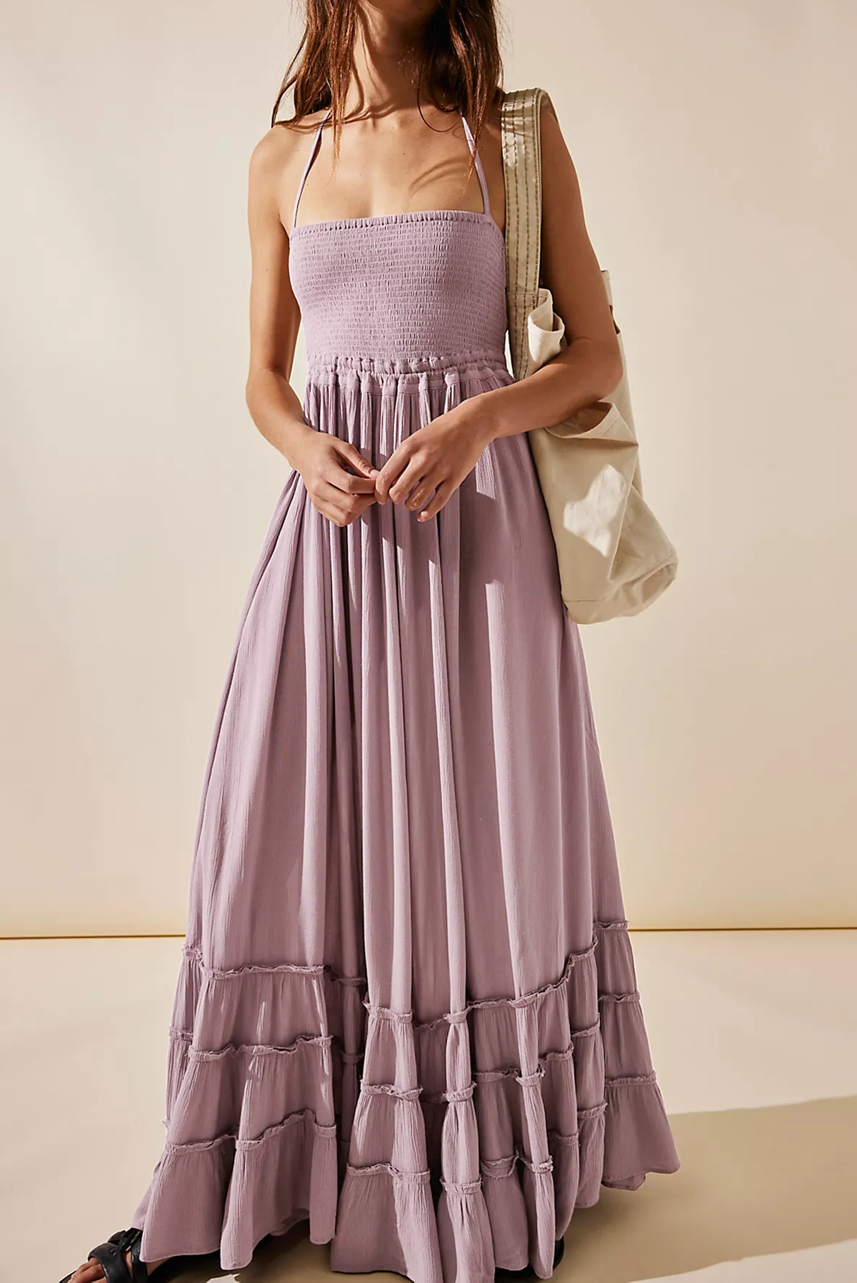 The slim fit dress blends romance and Bohemian, exuding a feminine vibe! It features a smocked bodice which flexibly fit different bust sizes while keep snug at the chest area. In additions, adjustable tie at the halter and back waist make this dress easy fit and easy to throw on!
