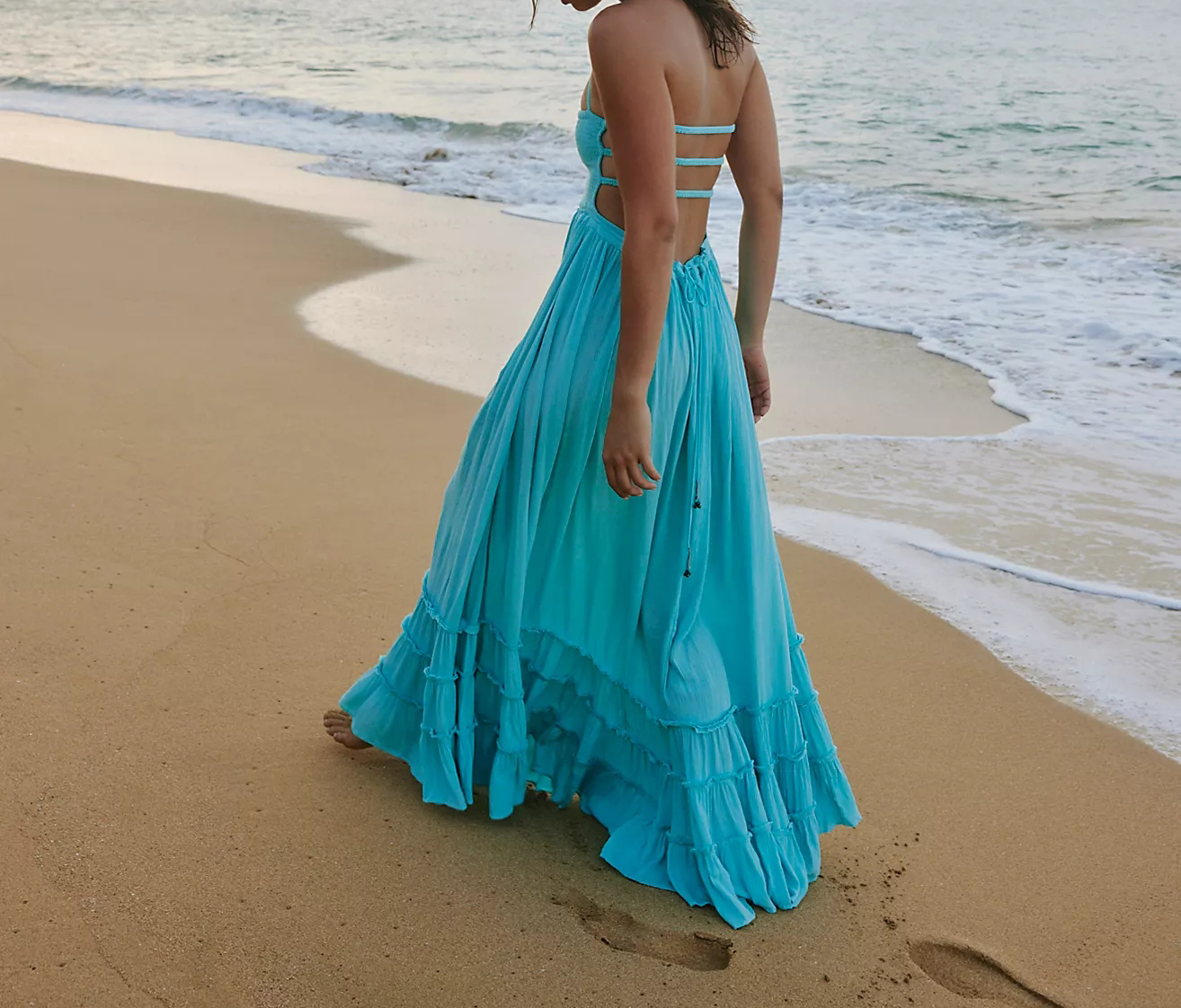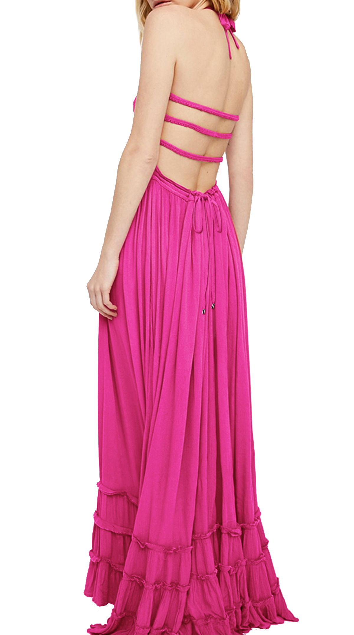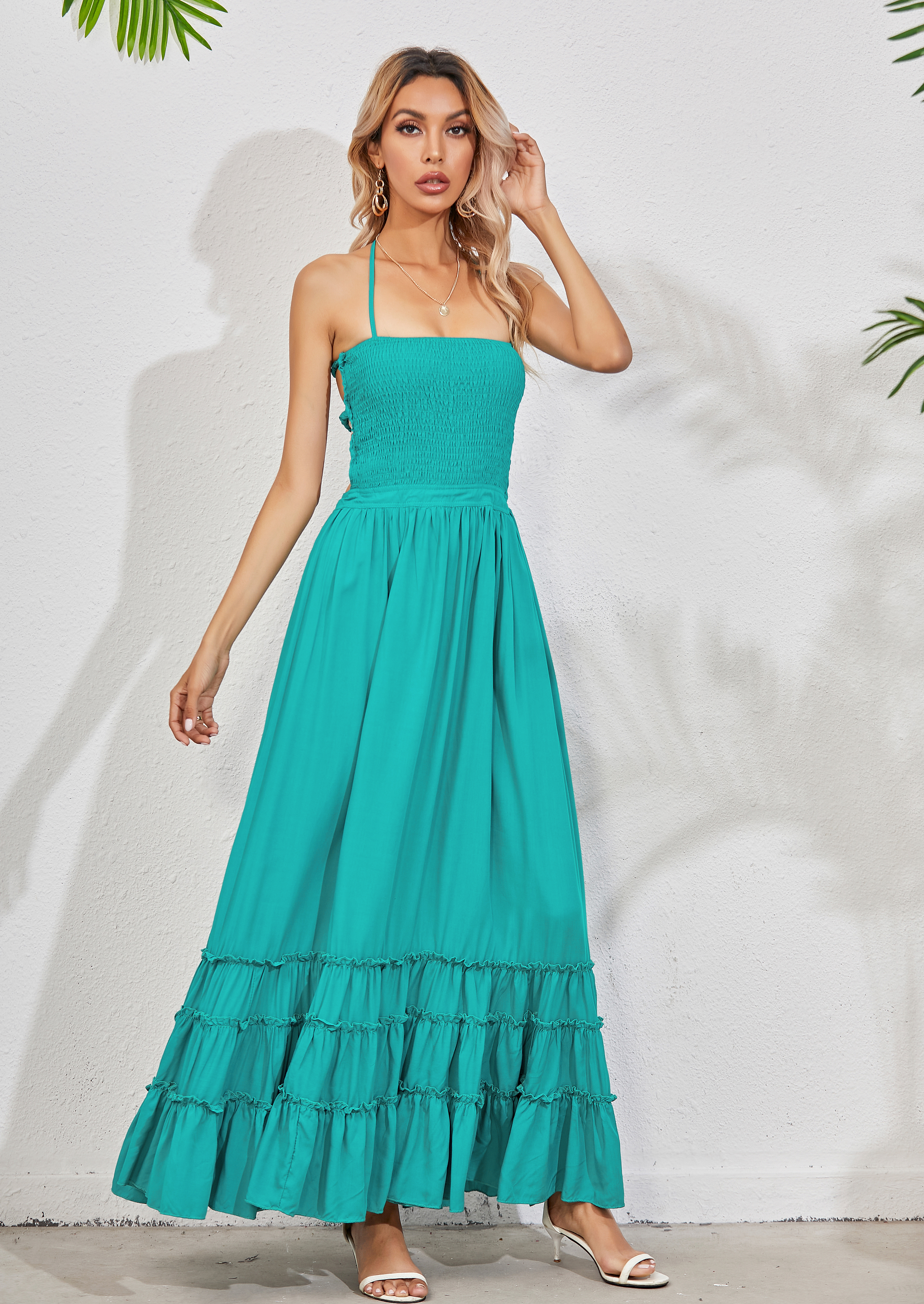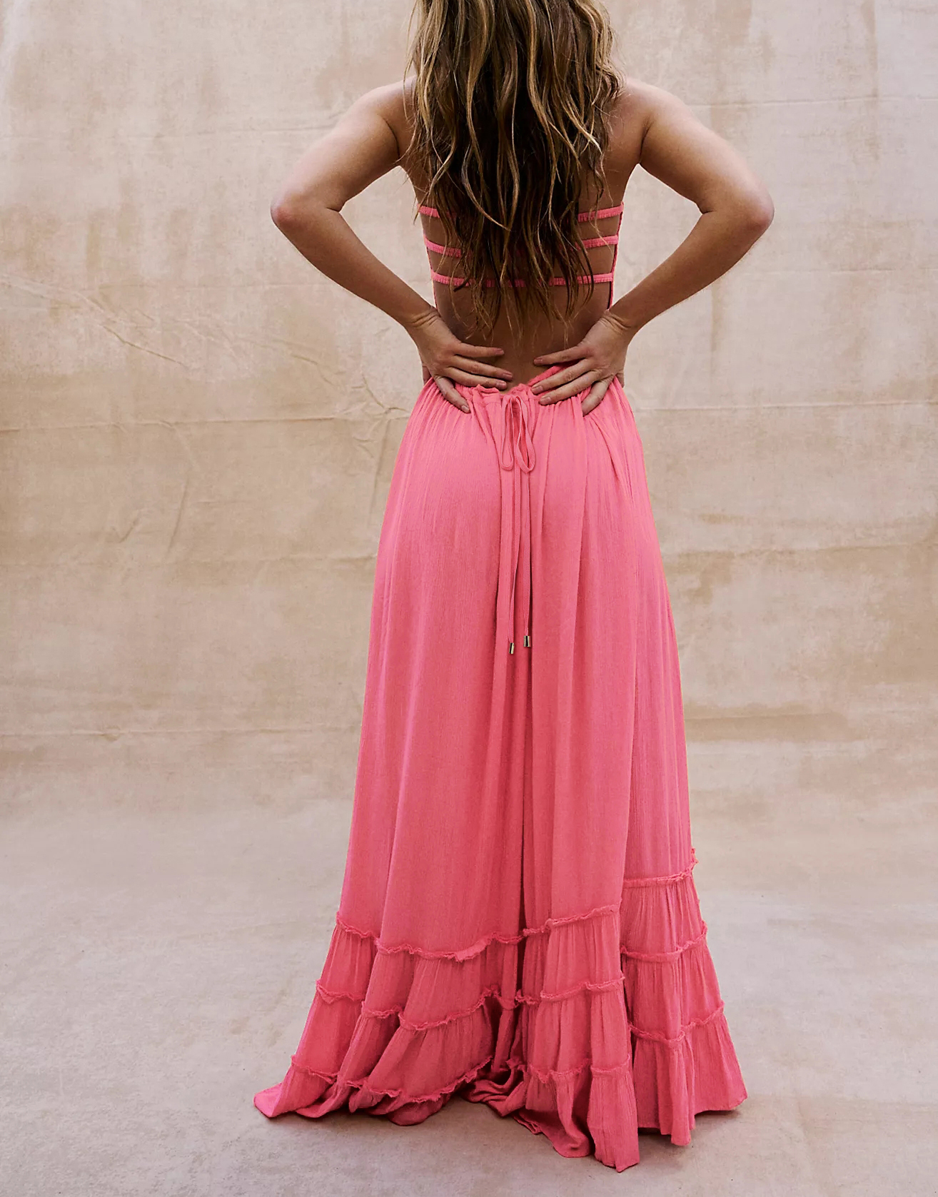 The tiered ruffle maxi silhouette is not only trendy but also flattering. The dress drapes beautifully, creating a flowy fit. The open back and ruffle hem design adds a sexy and playful feeling that is perfect for Summer Beach, Vacation, Holiday, Party, Engagement Photo Shoot, Travel, Carnival, etc.