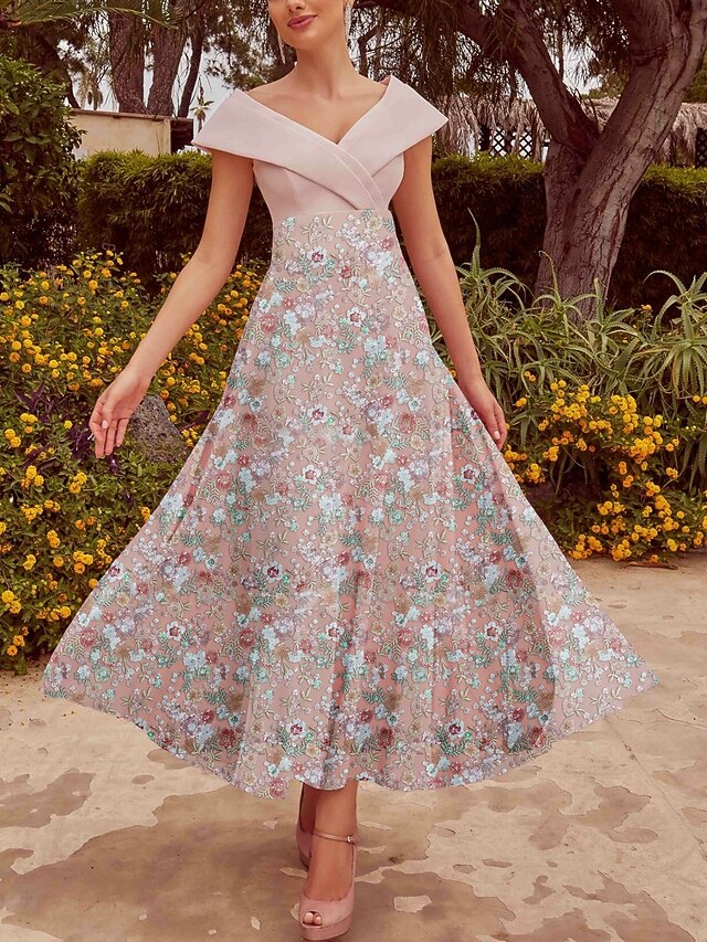 More information about Floral A-Line Embroidered Cocktail Dresses Elegant Dress Formal Wedding Guest Ankle Length Short Sleeve Off Shoulder Sequined with Glittery Dresses