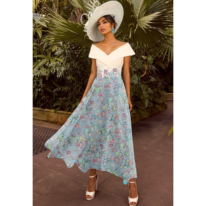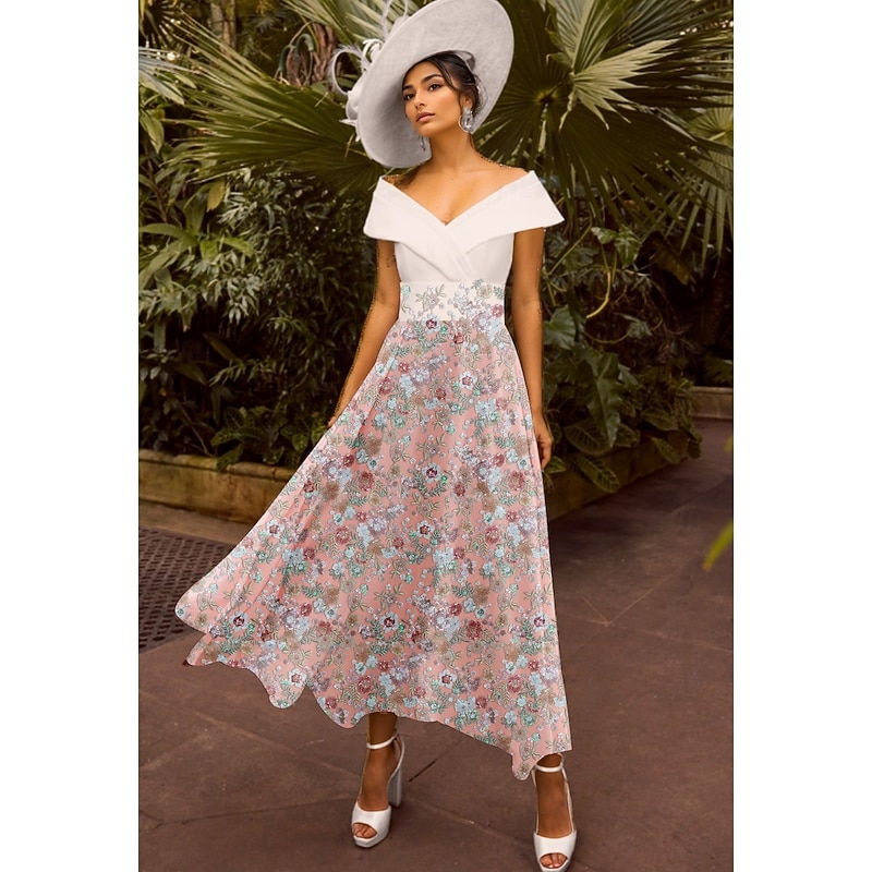 Floral A-Line Embroidered Cocktail Dresses Elegant Dress Formal Wedding Guest Ankle Length Short Sleeve Off Shoulder Sequined with Glittery Dresses 1