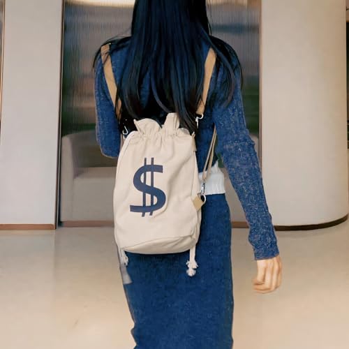 HOT ! Canvas Drawstring Backpack with Coin pouch, Large Money Dollar Sign Bucket Rucksack, Lightweight Sport Bags (Off White)