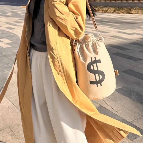 More information about Canvas Drawstring Backpack with Coin pouch, Large Money Dollar Sign Bucket Rucksack, Lightweight Sport Bags (Off White)