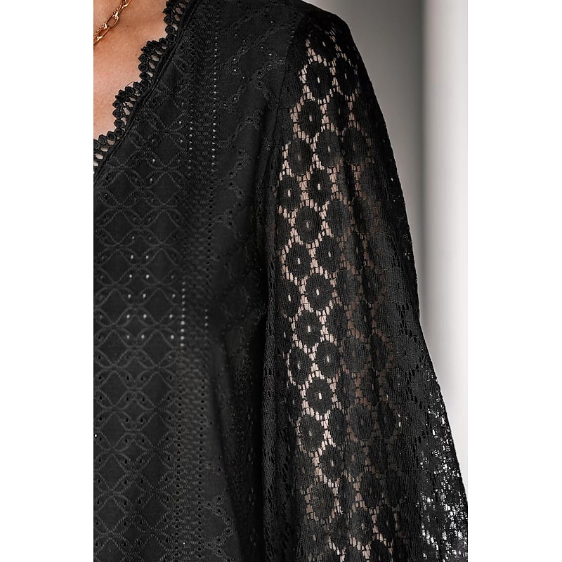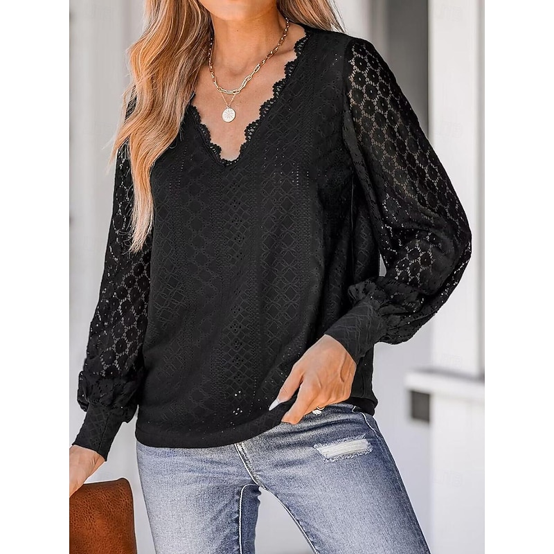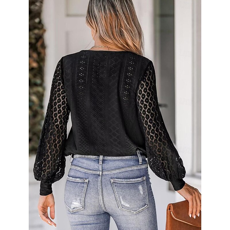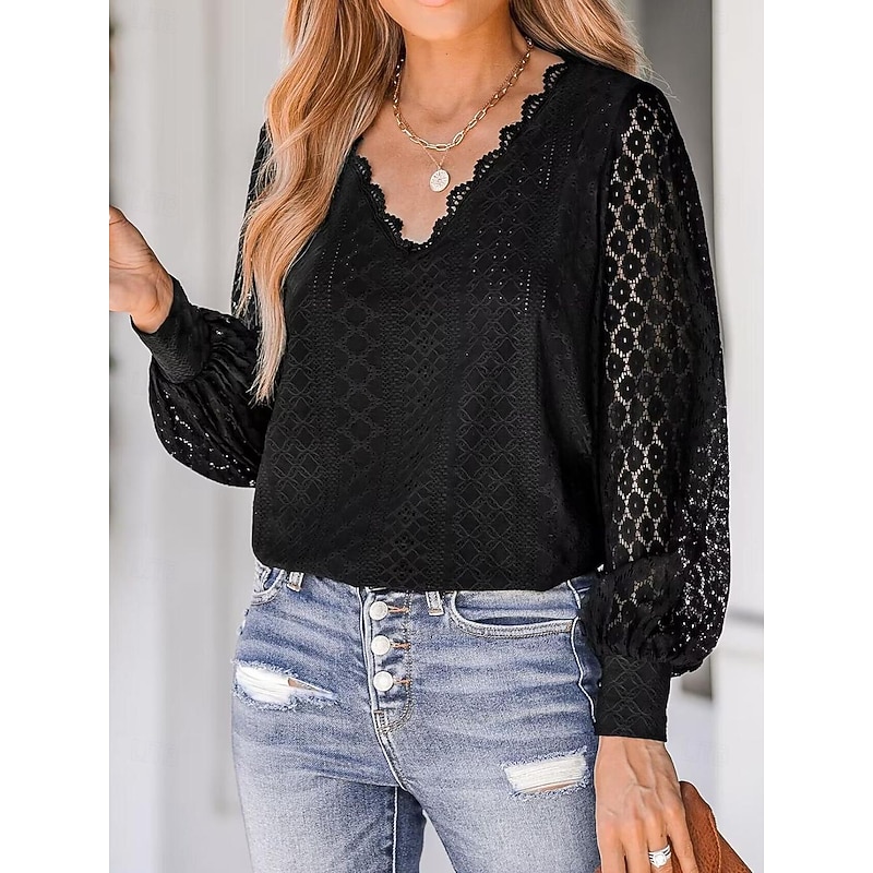 Featuring an elegant V-neckline with a scalloped edge, this blouse is adorned with intricate lace and cut-out details, adding a touch of femininity. The long sleeves boast delicate lace patterns and slightly puffed cuffs, creating a romantic and sophisticated look.
