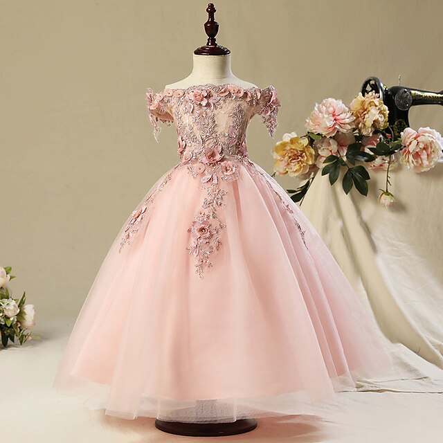 Flower Girl Dress Girls' Dress Princess Dress Party Dress Wedding Party Pegeant Elegant Princess Sweet Mesh Flower Short Sleeve Off Shoulder Wine Red White 3-10 Years 16