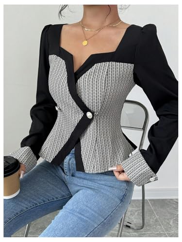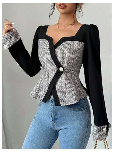 HOT ! GORGLITTER Women's Color Block Double Breasted Blazer Puff Sleeve Wrap Notch Neck Cardigan