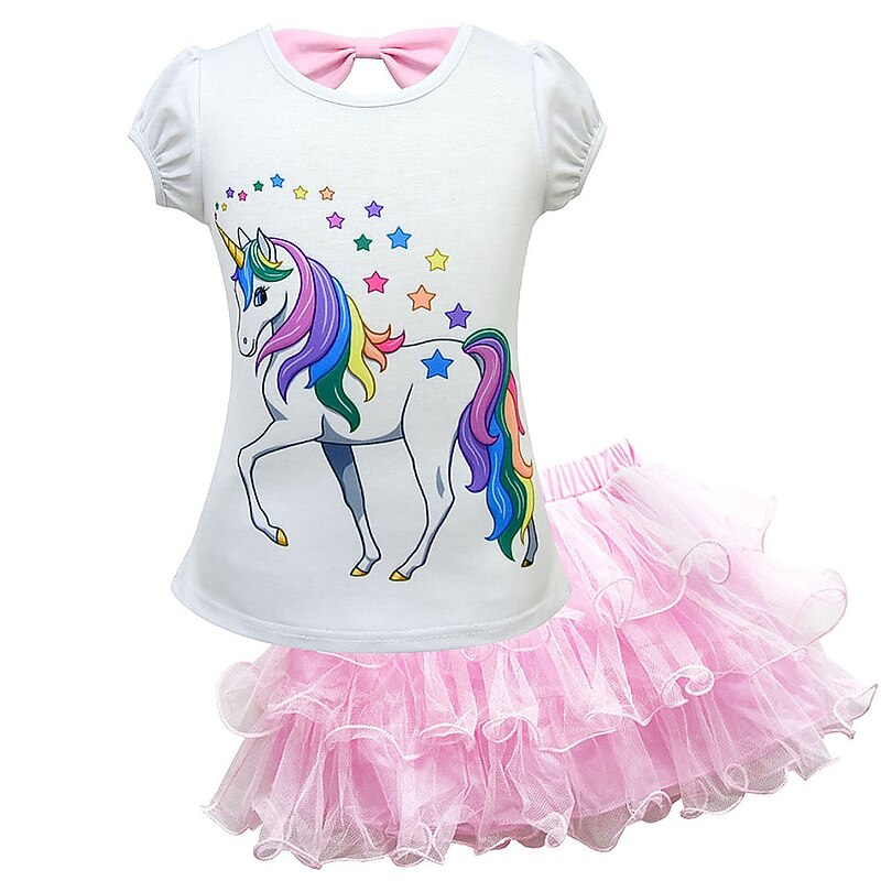 Kids Girls' Unicorn 2Pcs T-shirt&Skirt Clothing Set Bow Short Sleeve Purple Blushing Pink Fuchsia Horse Unicorn Cartoon Bow Tulle Cotton Basic 7