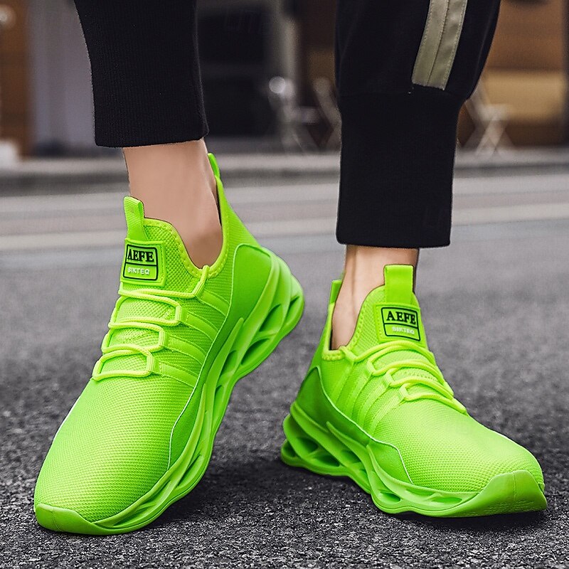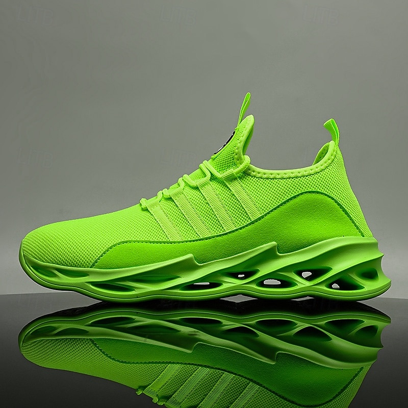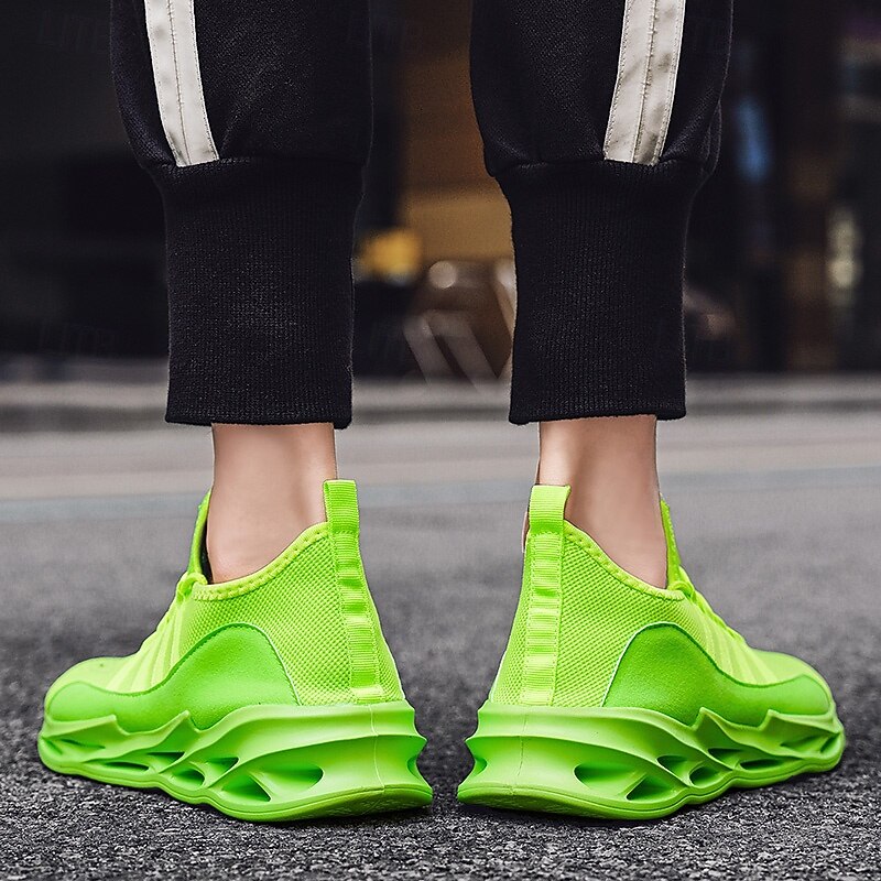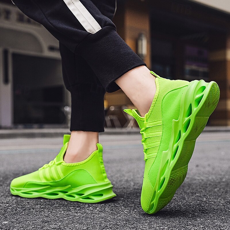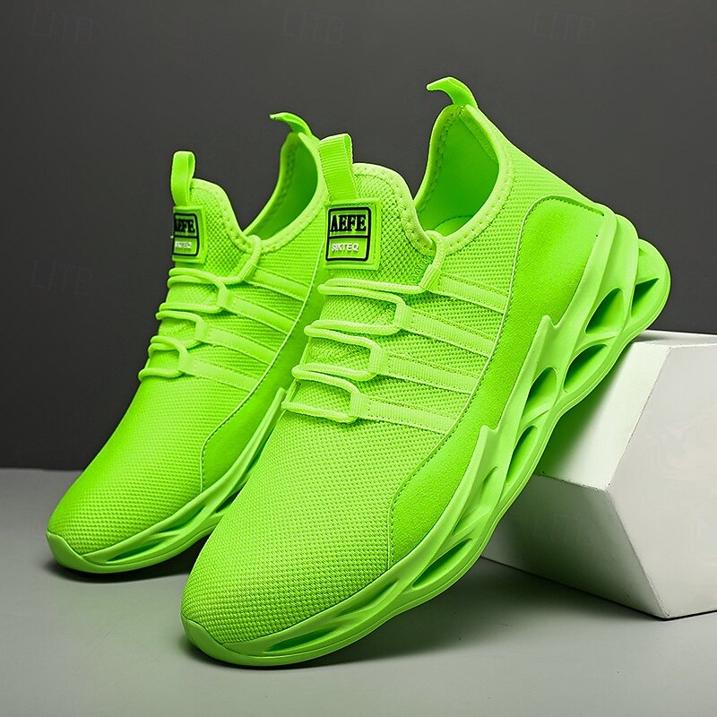 Highlights [Fabric] : Crafted from Tissage Volant for the upper and textile for the lining, these neon green athletic sneakers prioritize breathability and comfort. The mesh design ensures excellent ventilation, ideal for keeping your feet cool during intense workouts or long runs. [Fit] : Experience a sock-like fit with these sneakers, designed to enhance flexibility and ease of movement. The lightweight construction offers maximum agility, making them perfect for both sports and casual wear. [Design Highlights] : The sneakers boast a vibrant fluorescent green hue that captures attention, alongside a unique geometric pattern on the hollow-out rubber sole for robust support and shock absorption. The lace-up closure provides a secure fit, while the round toe shape adds to the comfort and modern aesthetic. [Occasions] : These sneakers are versatile for various settings, from hitting the gym or engaging in training sessions to casual day-to-day activities. They effortlessly combine style and functionality, fitting into athleisure looks or energetic sports routines. [Size Range] : Available in a variety of sizes to ensure the perfect fit for everyone; ranging from US7.5 / EU39 / UK6.5 / CN40 through to US11.5 / EU45 / UK10.5 / CN47. Whether you're lounging or actively on the move, these sneakers cater to a wide range of feet.
