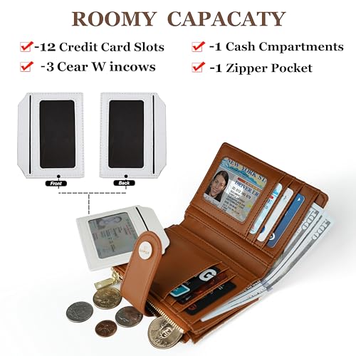 • Practical & Spacious Layout:This small wallet for women offers wider card slots for easy access in a compact design. It includes 12 card slots, 1 removable card sleeve, 3 id windows, a full-length bill compartment, and an expandable accordion-style coin pocket with a smooth zipper for quick access, making it a top pick as credit card wallets for women.