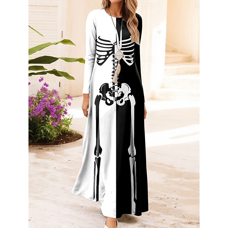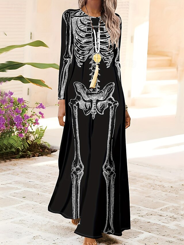 HOT ! Halloween Women's Skulls Print Maxi Dress Shift Dress A Line Dress Casual Daily Regular Fit Graphic Bull Long Sleeve Crew Neck Black Purple Fall Winter