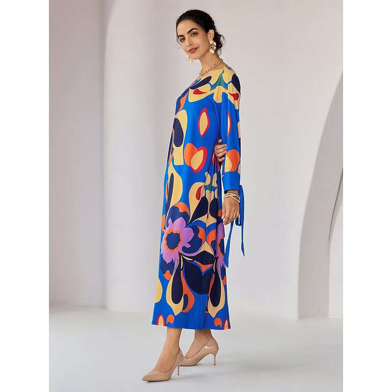 HOT ! Loose Floral Printing Fall Crew Neck Elegant Casual Midi Dress
