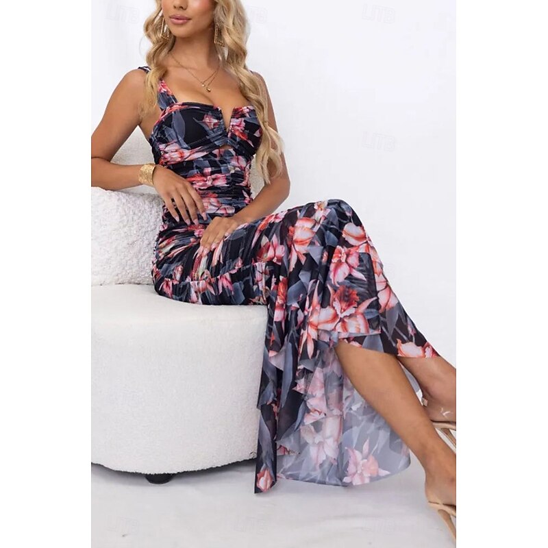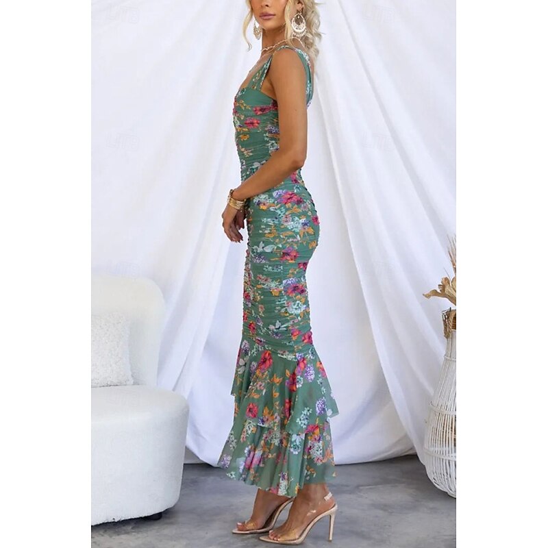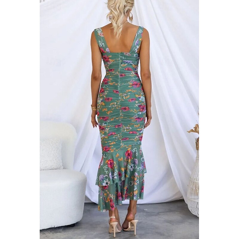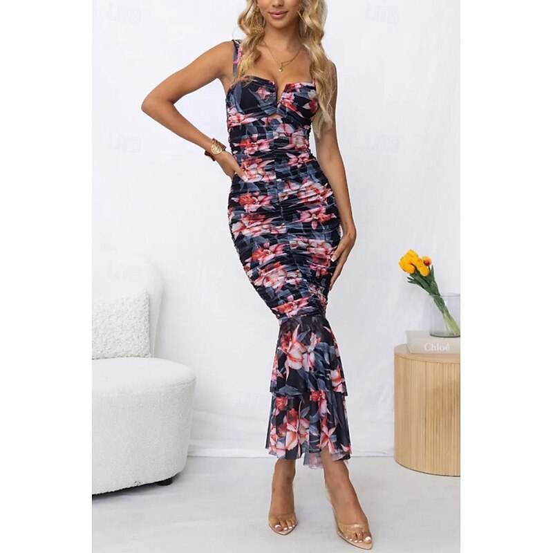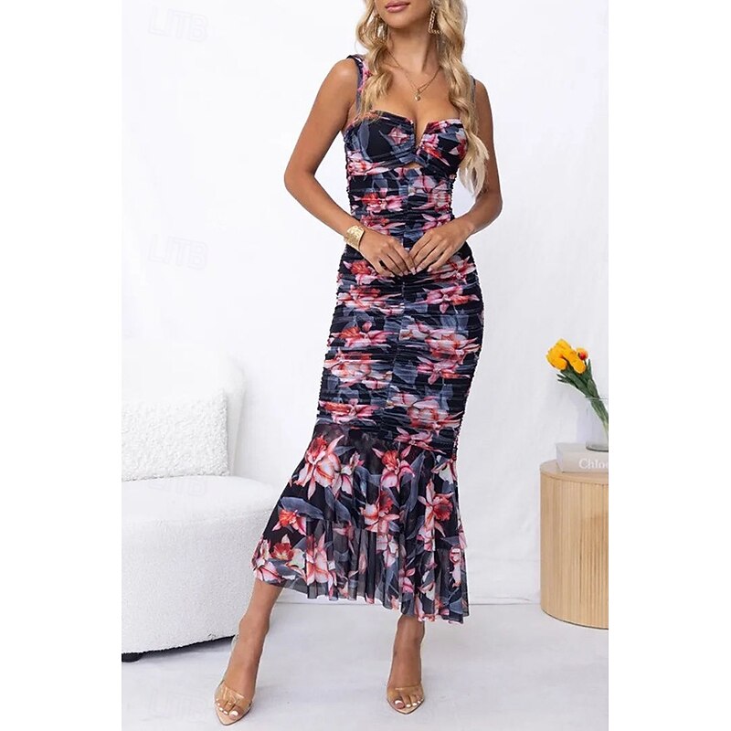HOT ! Women's Midi Dress Slip Dress Print Dress Ruched Dress Fashion Vacation Going out Weekend Regular Fit Flower Sleeveless Spaghetti Strap Black White Green Summer