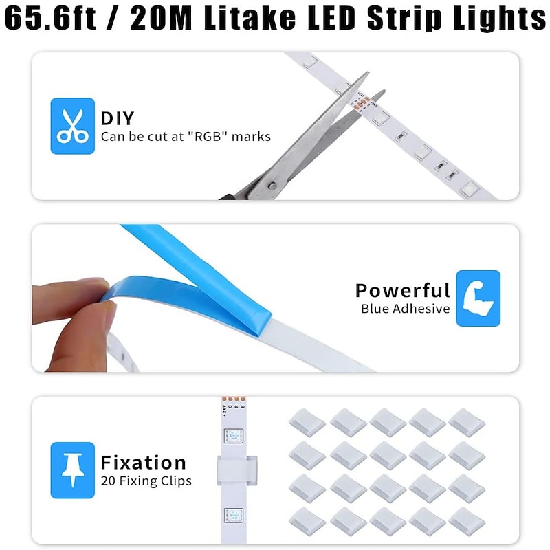 20M 65.6ft LED Strip Lights RGB Color Changing SMD 5050 Tape Lights Flexible for Bedroom Kitchen DIY Home Decoration 12V 10A 3