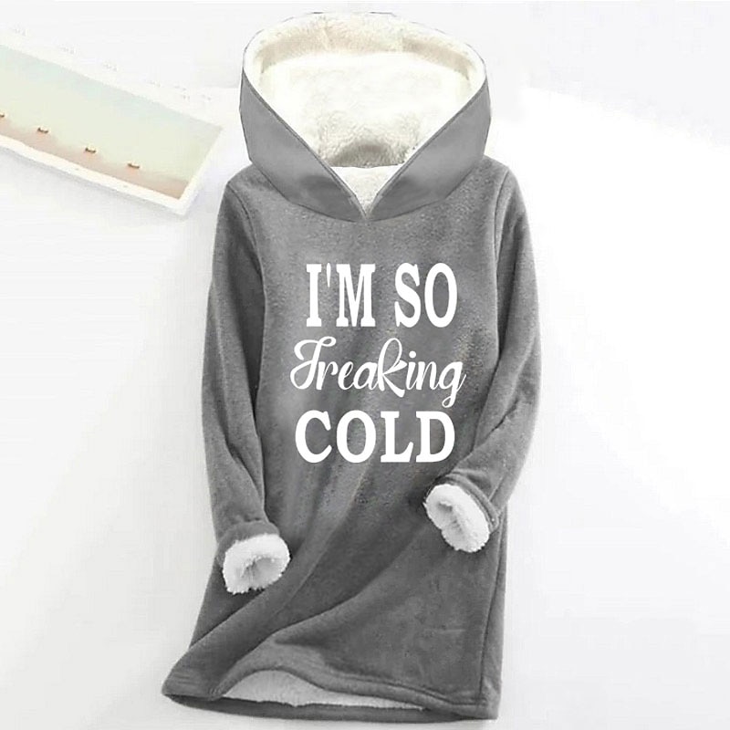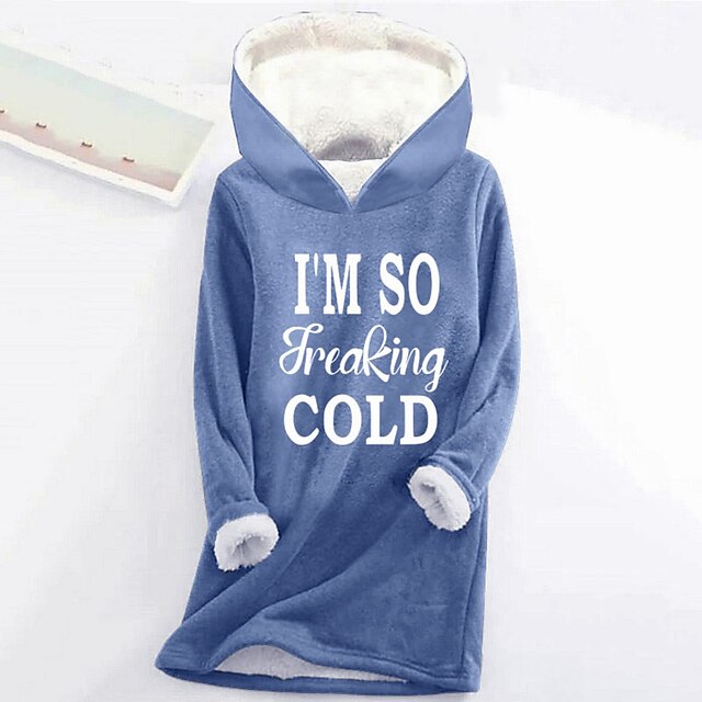 Highlights [Fabric] : Made from a blend of high-quality polyester and fleece, the Women's Hoodie Sweatshirt offers exceptional warmth and softness. The interior is lined with cozy sherpa fleece, providing additional insulation and a plush feel, perfect for autumn and winter weather. [Fit] : The hoodie features a regular fit with a long top length, designed to provide comfort and ample coverage. Its loose and relaxed style makes it ideal for casual wear and lounging at home, allowing you to stay warm and comfortable throughout the day. [Design Highlights] : This hoodie sweatshirt stands out with its playful "I'M SO Freaking COLD" letter print on the front, bringing humor and personality to your winter wardrobe. The generous hood offers extra protection against the cold, while the long sleeves ensure full coverage and coziness. [Occasions] : Perfect for casual outings, sports activities, or simply relaxing at home. This versatile piece is an excellent choice for staying warm indoors on chilly days or adding an extra layer when venturing outside. [Sizes] : Available in a range of sizes from S to 2XL, this hoodie caters to various body types, ensuring a comfortable fit for everyone. Whether you prefer a snug or relaxed fit, you can find the right size to suit your needs.
