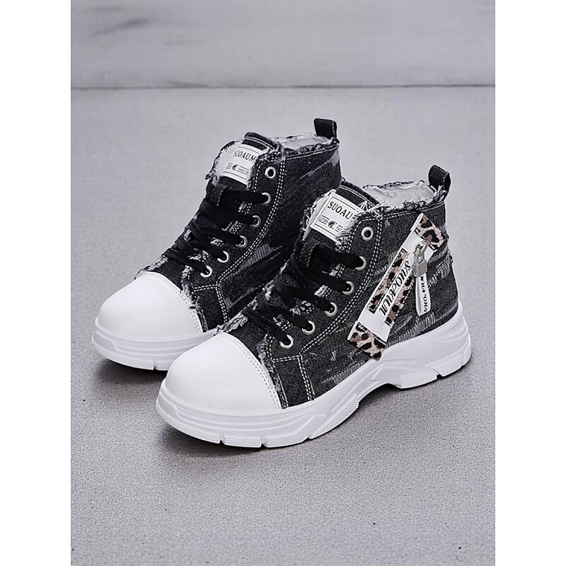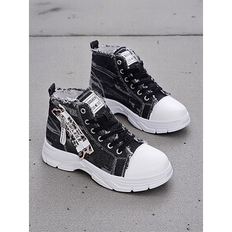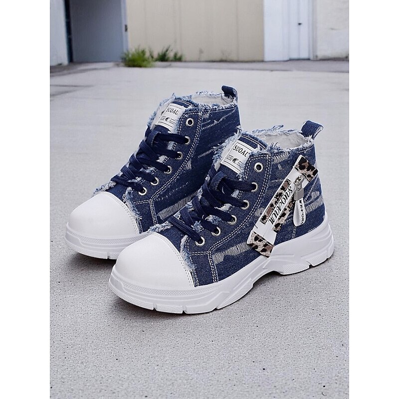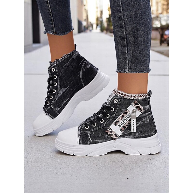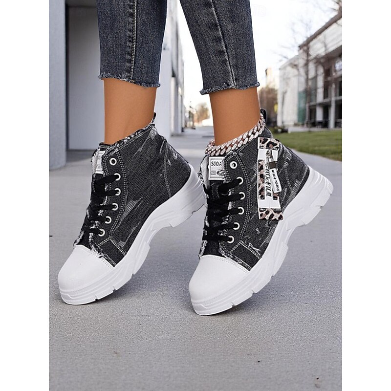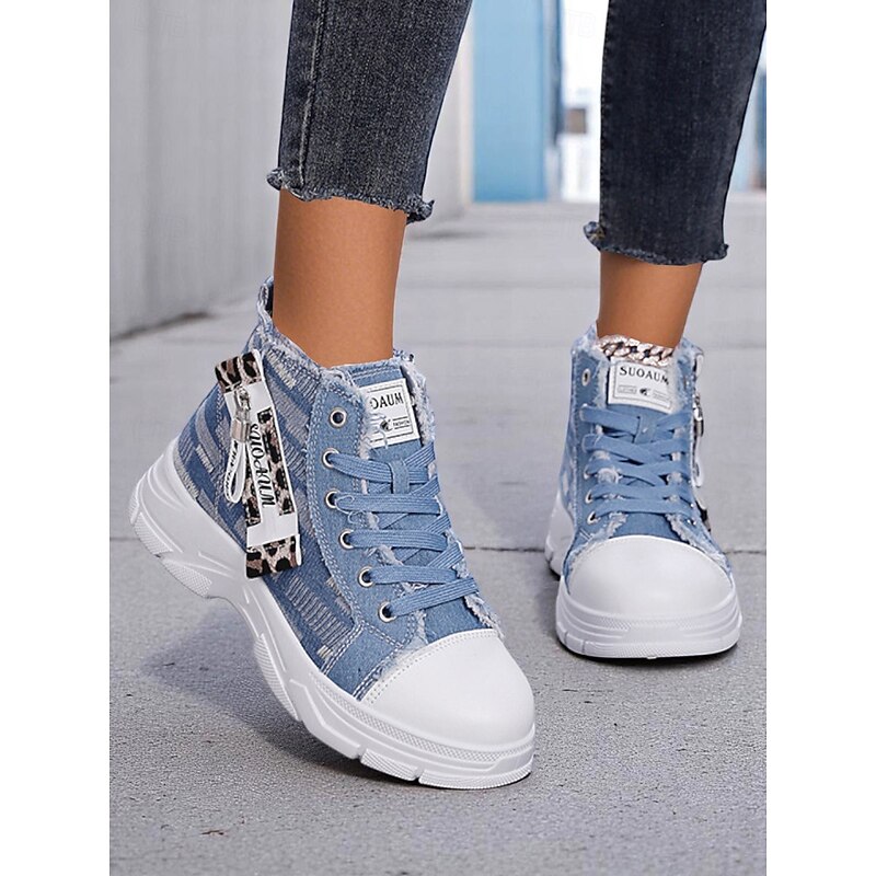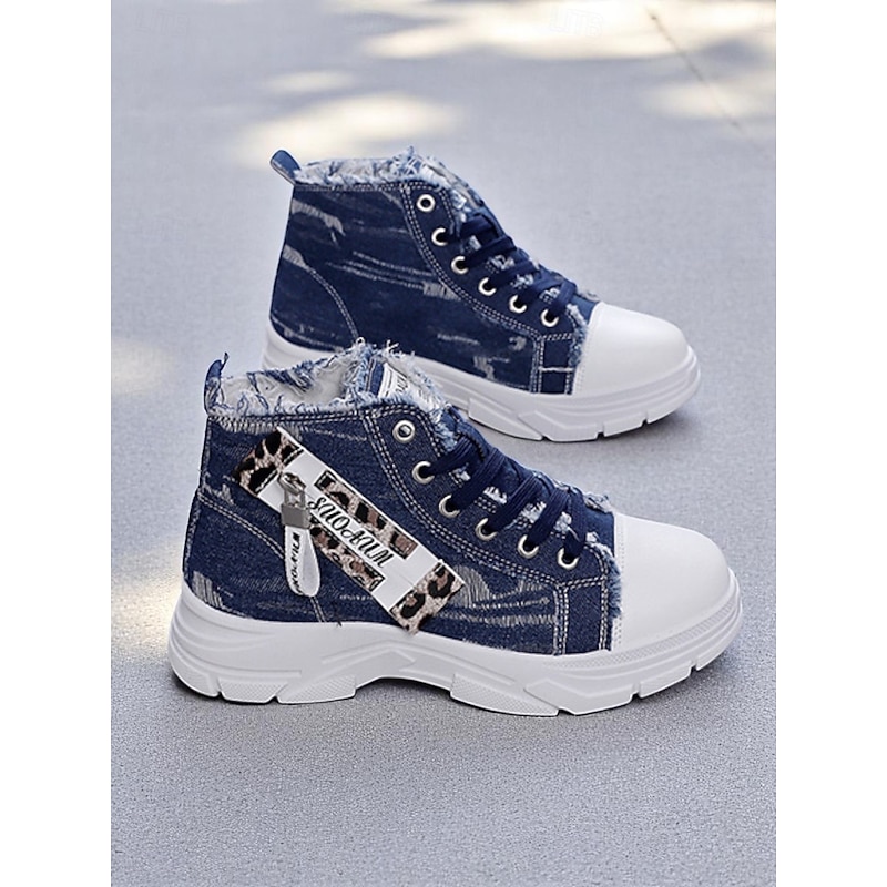 HOT ! Women's Denim High Top Platform Sneakers with Leopard Detail – Casual Street Style Lace-Up Shoes for Teens & Young Adults