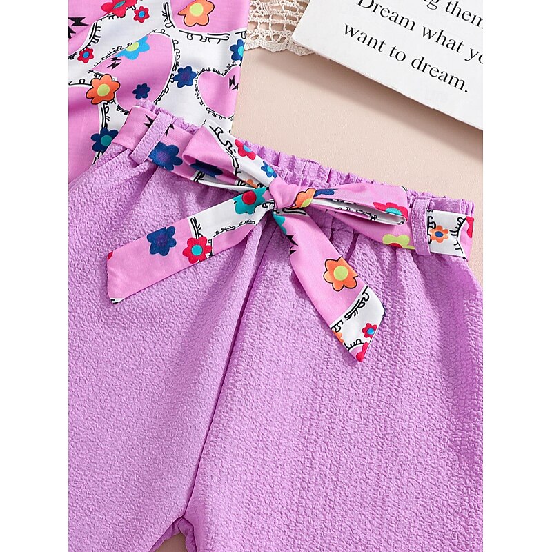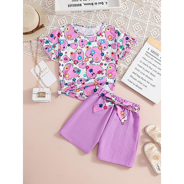 HOT ! 2 Pieces Kids Girls' Graphic Crewneck Shirt & Shorts Set Short Sleeve Fashion School 7-13 Years Summer Purple