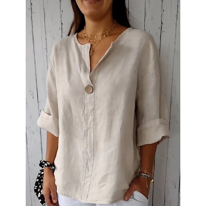 Highlights - Stay cool and stylish in this lightweight Cotton Linen Shirt, perfect for summer - Long sleeves provide a touch of elegance to your daily wear - Designed specifically for women, this V Neck shirt is a versatile addition to your wardrobe - Solid color and button design add a classic touch to any outfit.