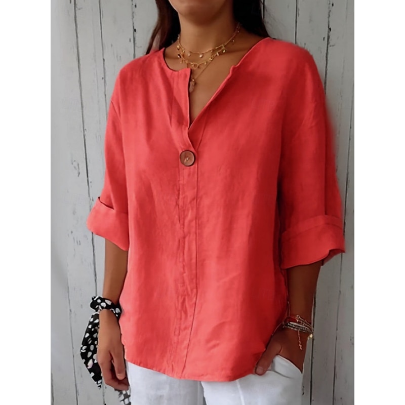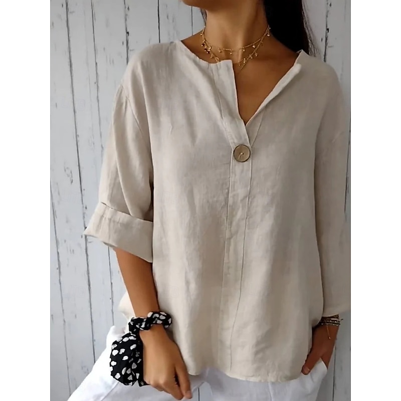 More information about Women's Cotton Linen Shirts Solid Color Daily Modern Long Sleeve V Neck Regular Tops Daily Holiday Buttons Black White Red Navy Blue Green Summer