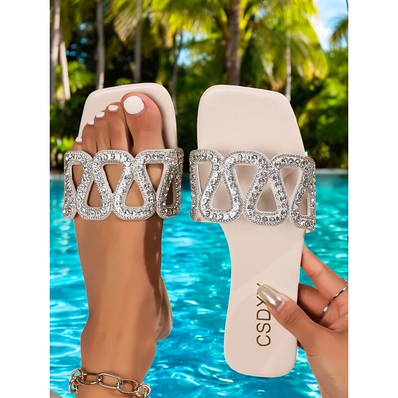 HOT ! Women's Rhinestone Slide Sandals – Elegant Slip-On Flat Sandals with Sparkling Crystal Cutout Design for Summer, Beach and Casual Wear