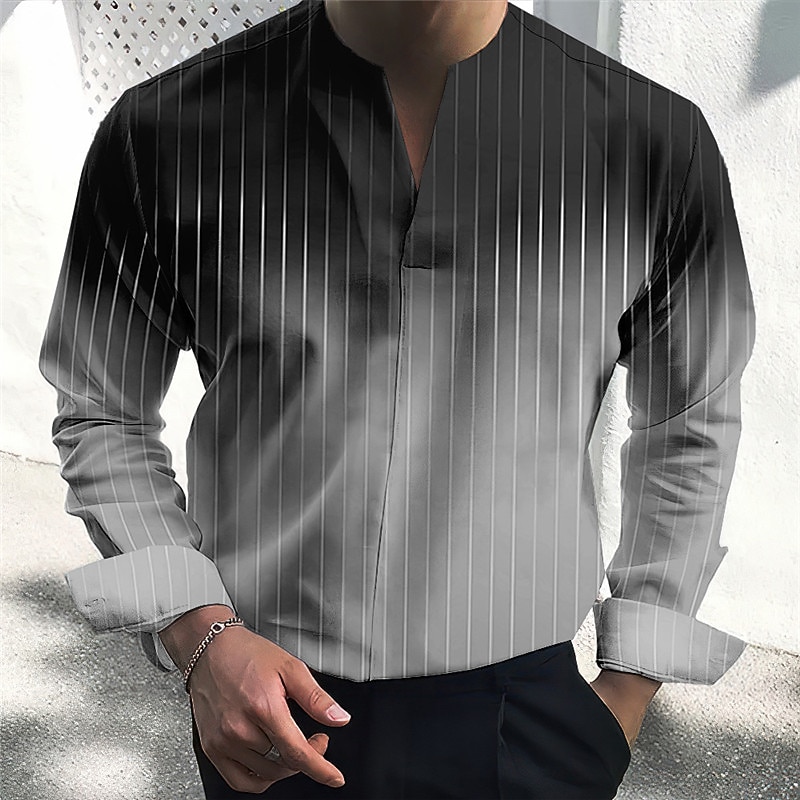 : This stylish shirt showcases a captivating gradient stripe design, seamlessly transitioning from darker shades at the shoulders to lighter hues at the waist. The geometric print pattern adds a modern flair, and the mandarin collar elevates the overall sophistication of the piece.