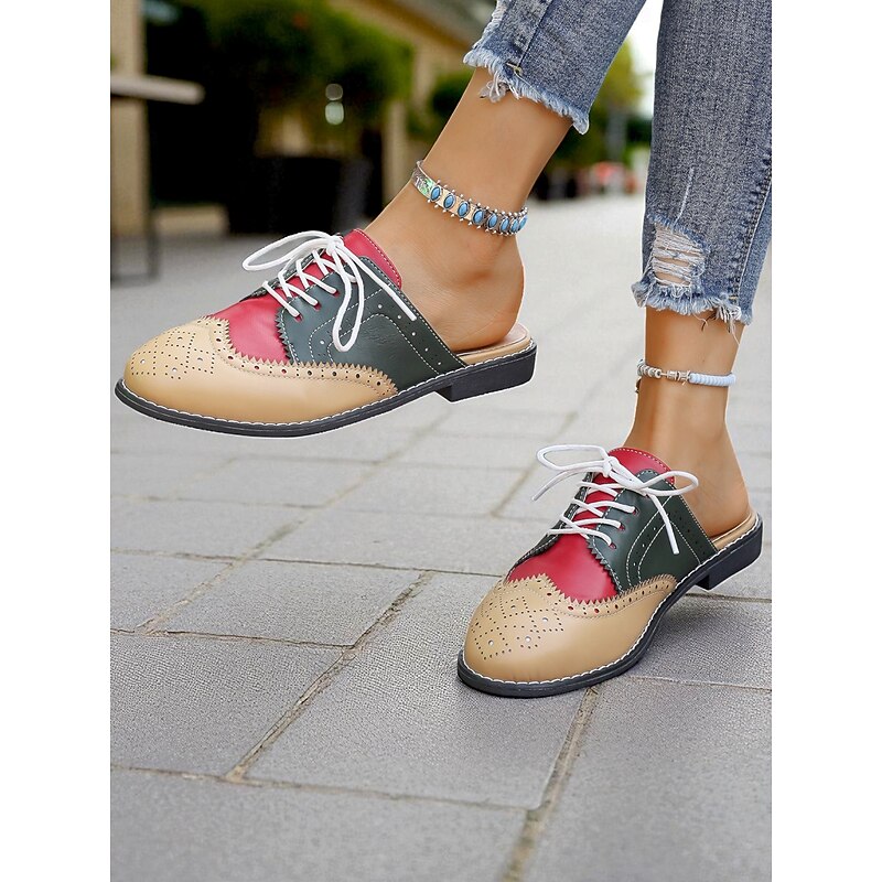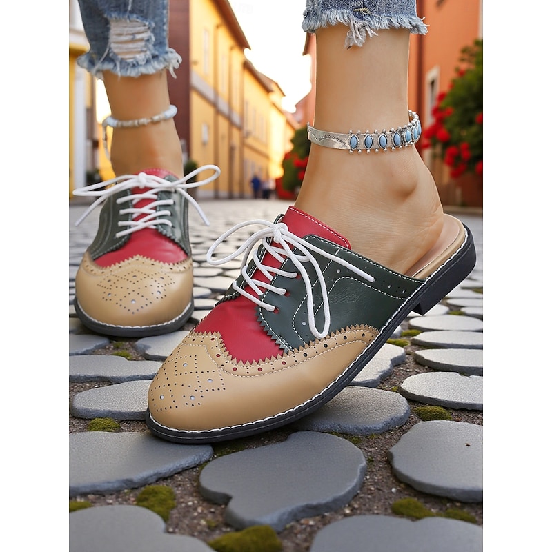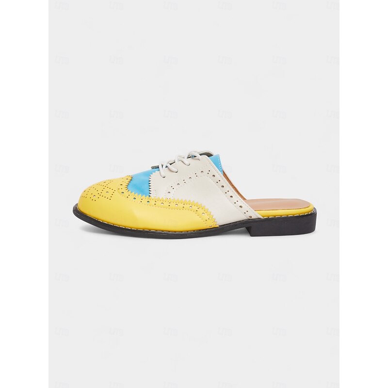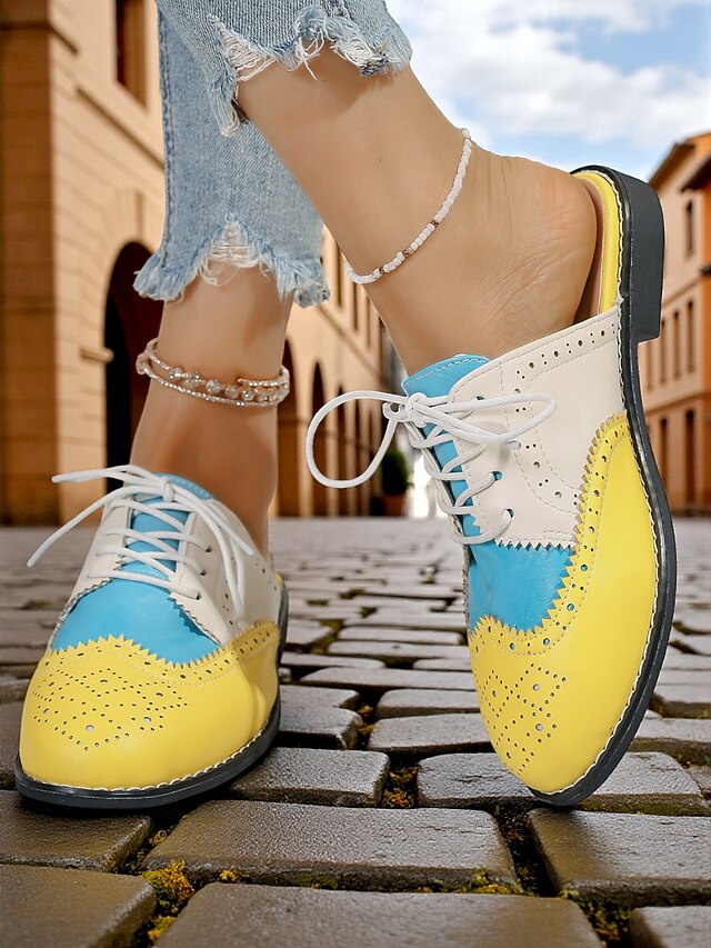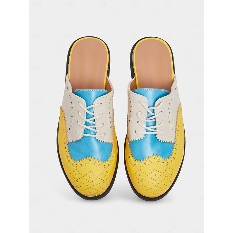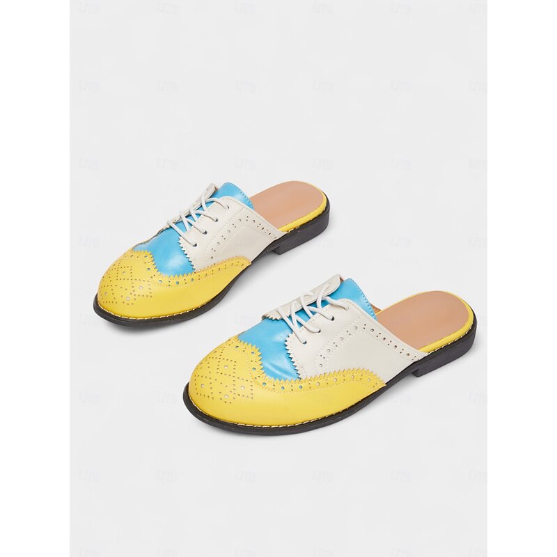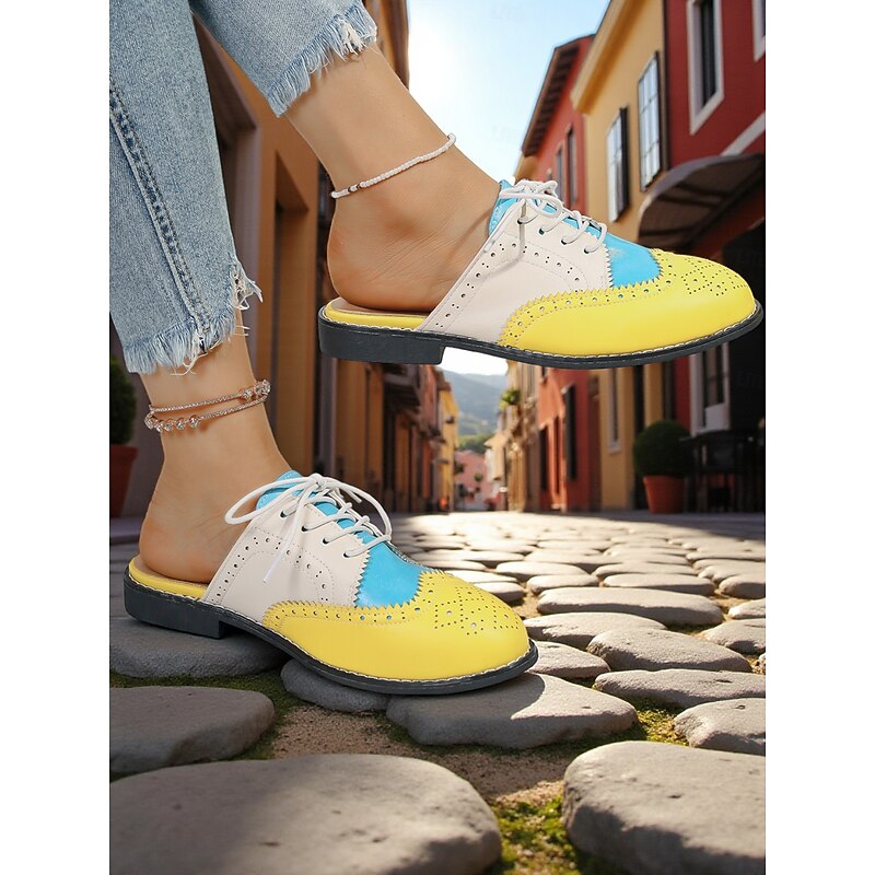 HOT ! Women's 1950s Vintage Colorblock Wingtip Mule Oxford Shoes - Yellow Blue Slip-On Lace-Up Flats for Casual Street Style, Outings and Weekend Travel