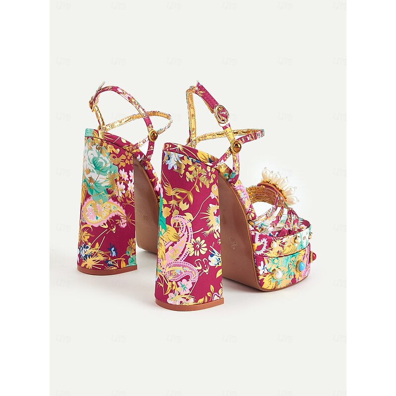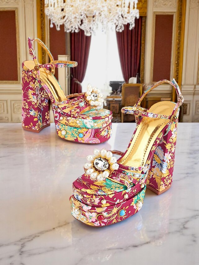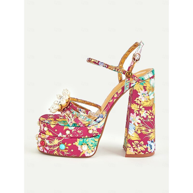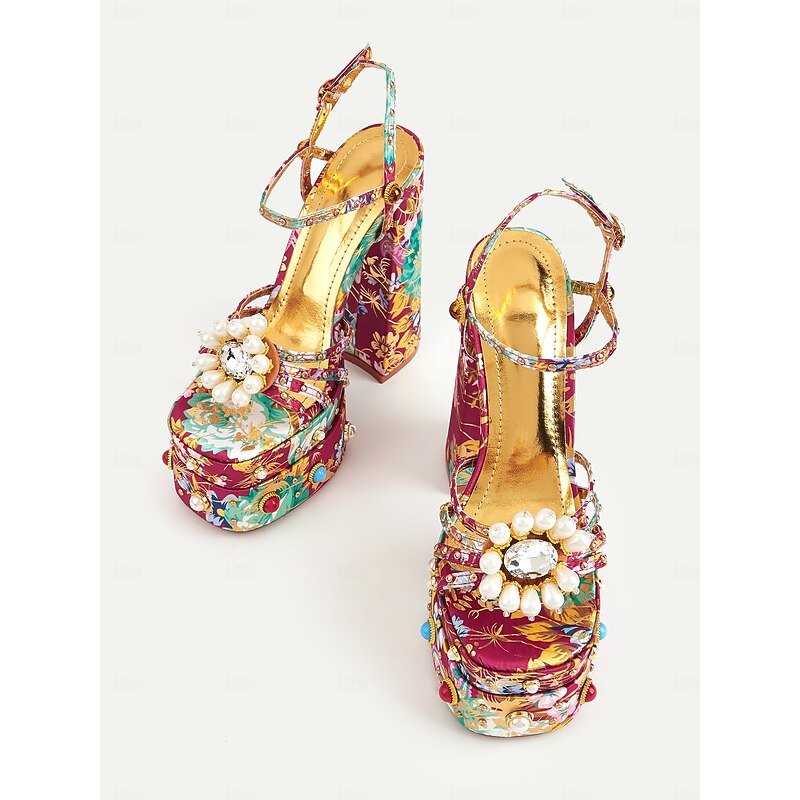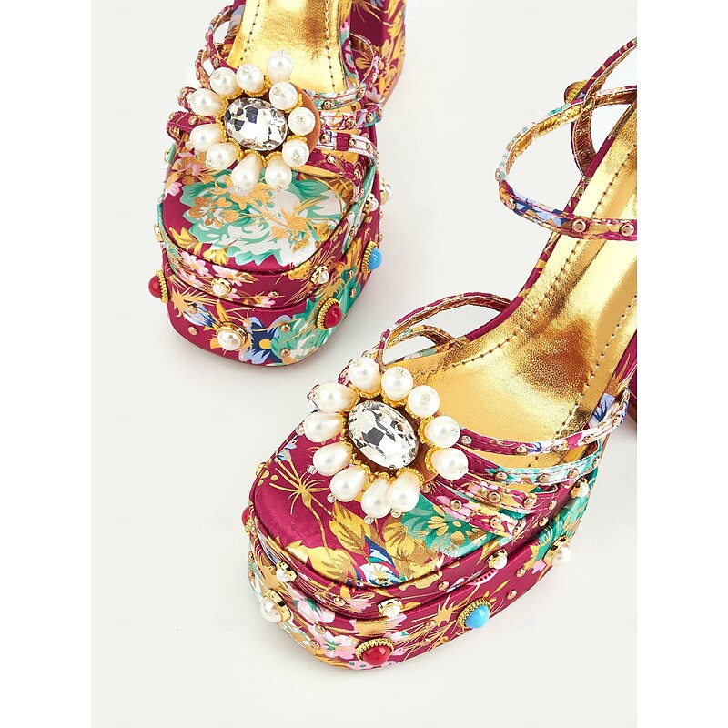 HOT ! Women's Floral Platform High Heels – 1920s Colorful Baroque-Style Sandals with Pearl Embellishments for Parties, Stage Shows, and Glamorous Occasions