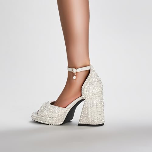 Women's open-toe pearl high-heeled sandals Chunky Buckle Ankle Strap Wedding Heeled Sandals Dress Evening Bride Shoes 6