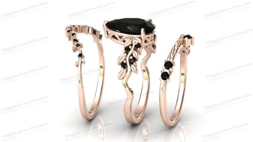 Vine Leaf Style 1 CT Black Onyx Engagement Ring Set Filigree 14k Gold Black Onyx Art Deco Wedding Ring Set Pear Shape Black Onyx Vintage Bridal Set Antique Anniversary Promise Ring Set 3
