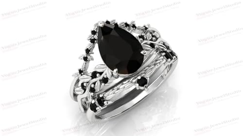 HOT ! Vine Leaf Style 1 CT Black Onyx Engagement Ring Set Filigree 14k Gold Black Onyx Art Deco Wedding Ring Set Pear Shape Black Onyx Vintage Bridal Set Antique Anniversary Promise Ring Set