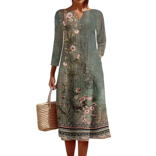 HOT ! Women's Dresses 3/4 Sleeve V Neck Pleated Button Down Dress Casual Midi Vacation Dresses with Pockets