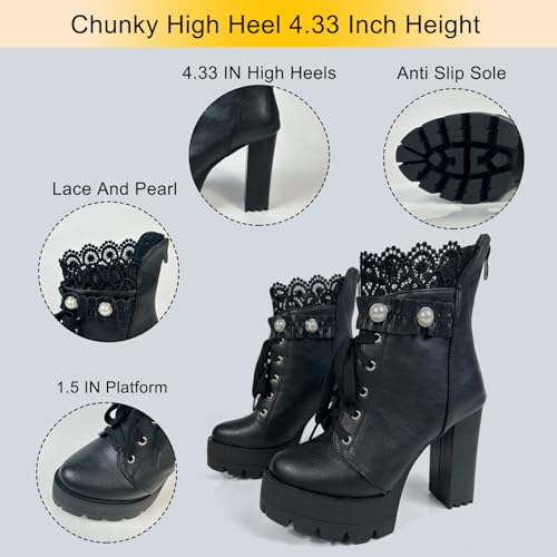 Black High Heel Boots For Women Platform Combat Booties Lace Up Goth Chunky Heeled Ankle Boot with Zipper 5