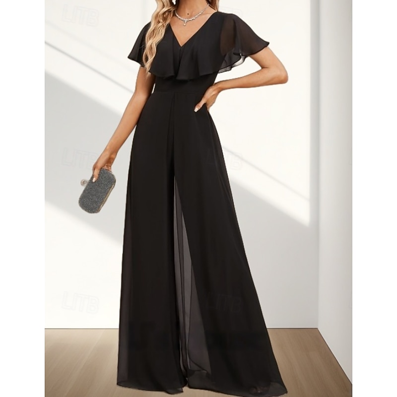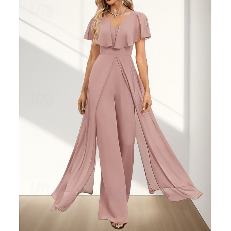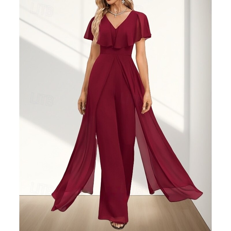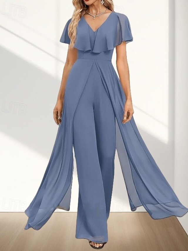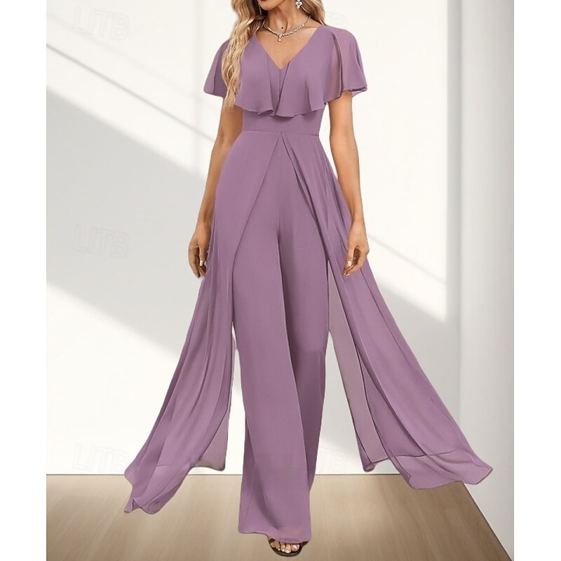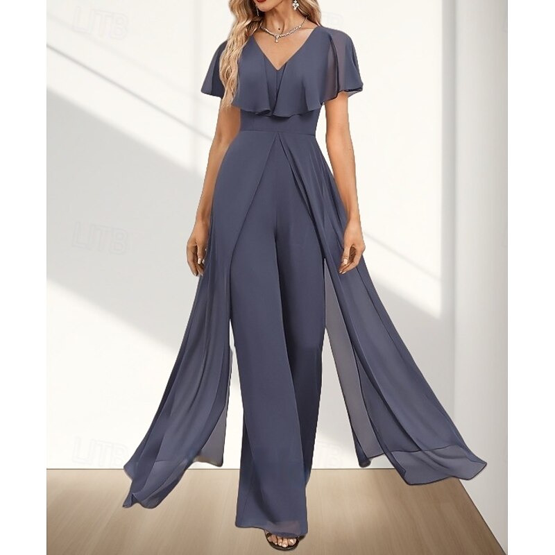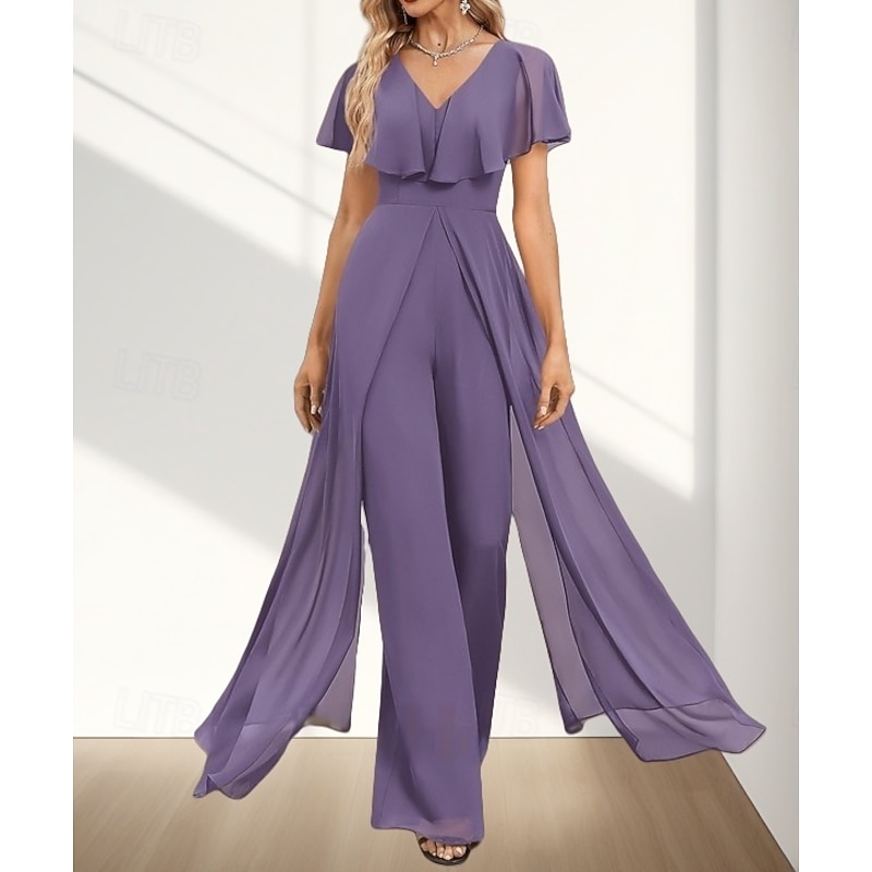More information about Jumpsuit / Pantsuit Mother of the Bride Dress Wedding Guest Elegant V Neck Floor Length Chiffon Short Sleeve with Ruffles Side Draping