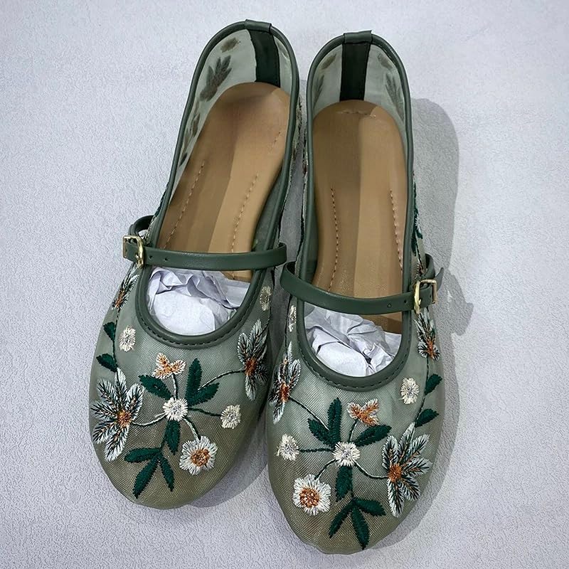 Elbslutt Mesh Ballet Flats for Women Slip On Ballerina Flats Shoes Tulle Floral Embroidered Mary Jane Buckle Strap Round Toe Comfortable Casual Work Dress Shoes,Size 8.5,Green 4