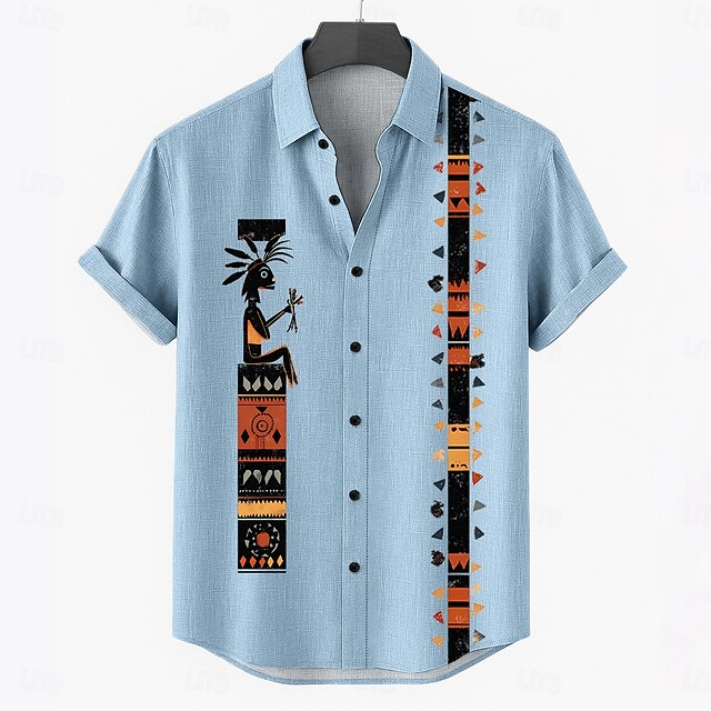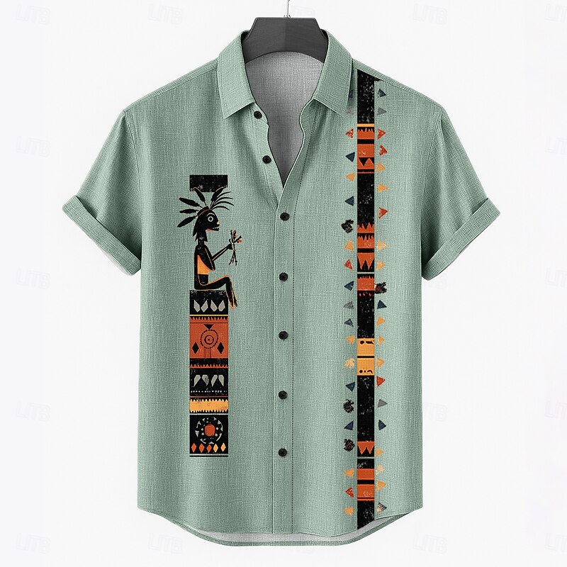 Men's Linen Shirt Summer Shirt Beach Wear Button Up Shirt Tribal Vacation Casual Blue Green Khaki Short Sleeve Turndown Summer Spring Clothing Apparel 1