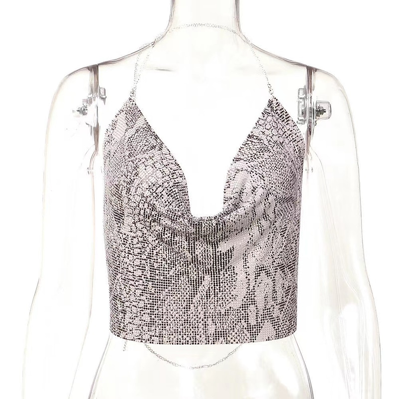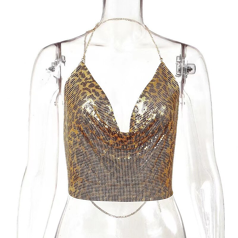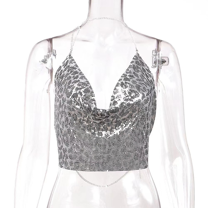 HOT ! Women Metal Sequin Sparkle Glitter Tank Deep V Neck Spaghetti Strap Backless Chain Halter Crop Tops Party Blouse 1980s Disco Party Club