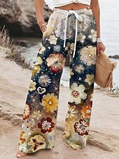 More information about Women's Wide Leg Pants Trousers Vacation Casual Long High Waist Floral Elastic Waist Printing High Cut Breathability Soft Micro-elastic Vacation Street Daily Wear Dark Navy Spring Fall Regular Fit