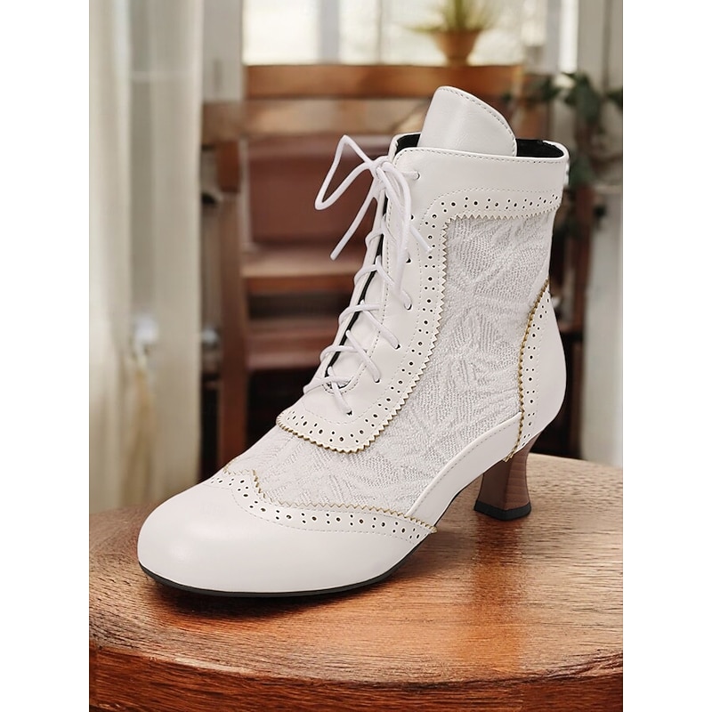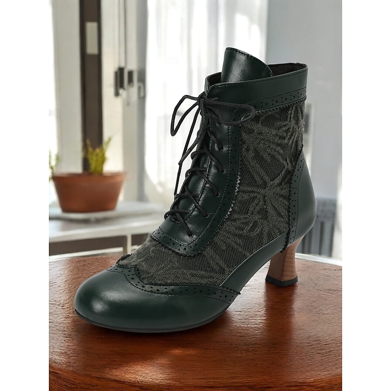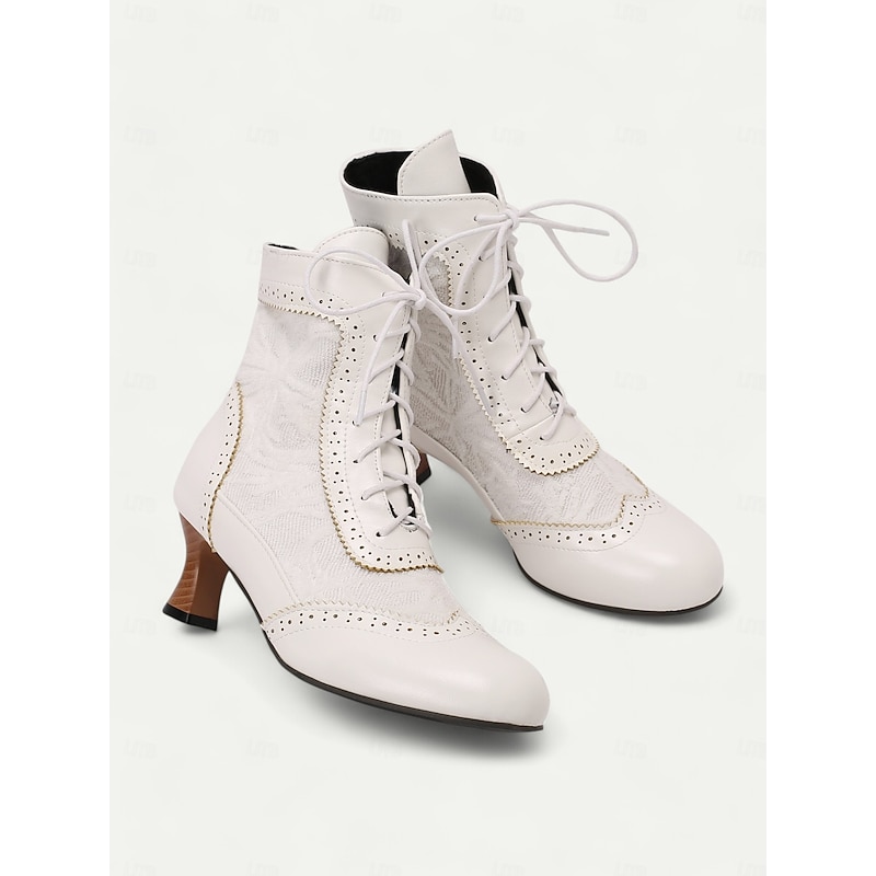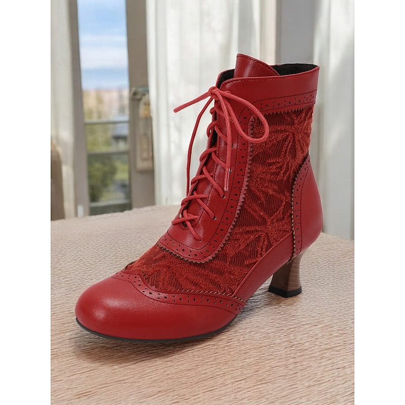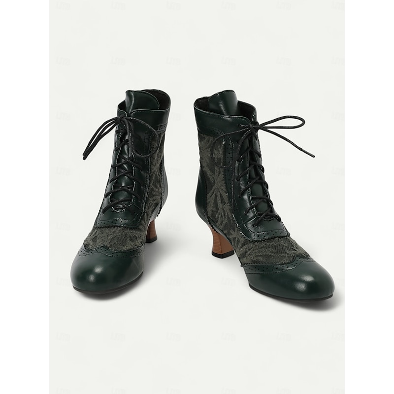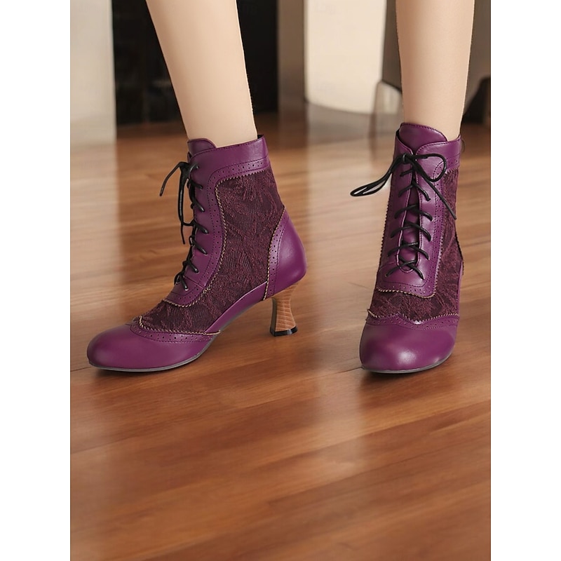 Highlights [Fabric] : These Victorian-style women's ankle boots are crafted with a refined combination of lace and PU material, offering both sophistication and durability. The rich textile lining ensures comfort and breathability, ideal for all-day wear. [Style] : Featuring a vintage and elegant style, these boots have a timeless appeal with a round toe and stiletto heel design. The mid-height block heel provides support while maintaining an air of traditional elegance suitable for various outfits, from skirts to trousers. [Design Highlights] : The boots showcase intricate lace detailing and a classic lace-up front, bringing a touch of vintage charm and practicality. Perforated accents along the seams reflect fine craftsmanship and add an element of sophistication. The floral pattern enhances their unique character, making them perfect for those with an appreciation for traditional aesthetics with modern comfort. [Occasions] : Perfect for daily wear, work environments, or even themed costume occasions. These versatile boots complement a wide range of activities and events, adding a chic vintage flair to your ensemble for any setting. [Size Availability] : Offered in a variety of colors including brown, white, black, purple, red, and dark green, these boots are available in sizes US5.5 to US10.5. The standard sizing ensures a comfortable fit, allowing you to select your usual size with confidence.