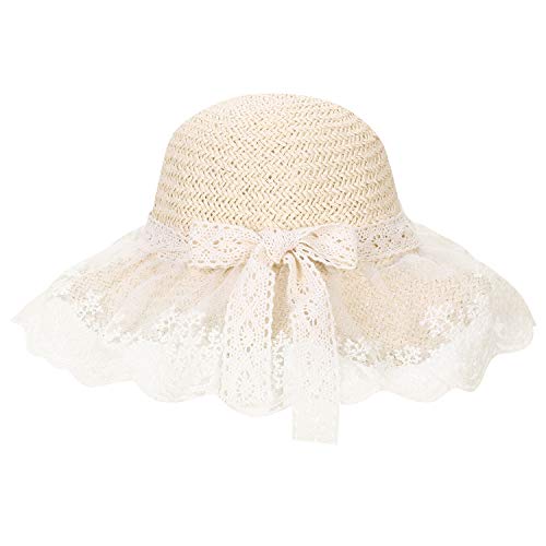 More information about Summer Lace Straw Hats for Girls Wide Brim Floppy Beach Sun Visor Hat with lace Bowknot
