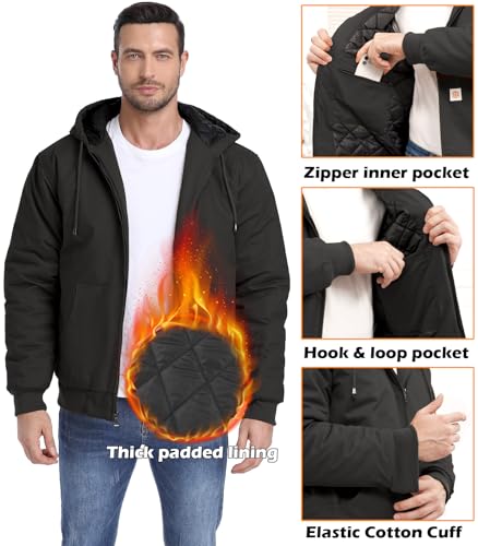• Wind-resistant Function: this mens hooded workwear jackets have a attached quilted-lined with draw-cord closure, features enough warm and wind-resistant; elastic rib knit hem and cuffs can best protect your body from cold wind, keep heat and comfortable.